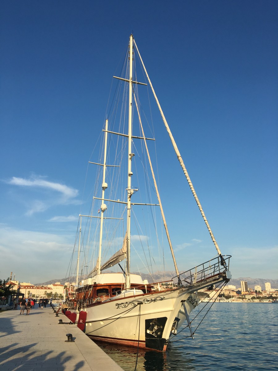 I am now on the Roadscholar tour. After breakfast we had a lecture about the twentieth century sculptor, Ivan Mestrovich. If you get a chance look at his works. Very impressive. We spent the morning walking through Diocletian’s Palace built in 295 CE. Some of the underground area reminded me of the Cardo in the Jewish Quarter of the Old City. Some of the streets within the palace reminded me of Fez, Morocco. After our tour we were on our own. I hooked up with a Jewish couple from Florida. He is a retired reform Rabbi. We visited the Split Sinagogue which is the third oldest active synagogue in Europe. They did not have a Rabbi. The Rabbi in Zagreb visits about once a year. There are about 100 Jews in Split, mostly culturally Jews. 2000 Jews in all of Croatia. They don’t do circumcision any more because of the fear of being identified as Jewish. Originally there were Jews here during the Roman time but many came after the Spanish Inquisition. The synagogues was built in 1510. Later in the afternoon I went out for gelato and a delightful walk around the harbor. Fell in love with an incredible schooner.