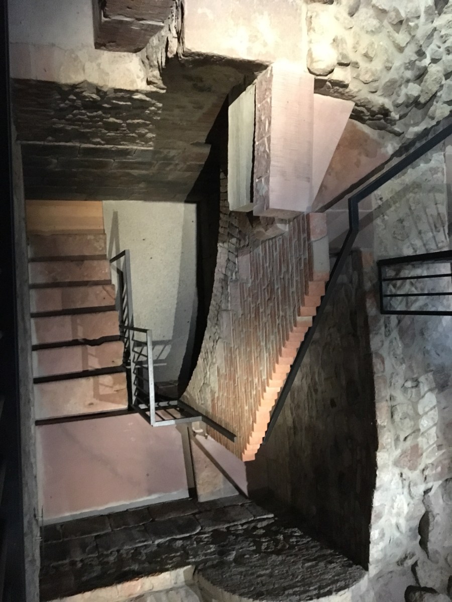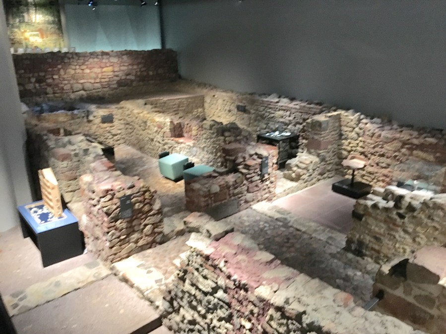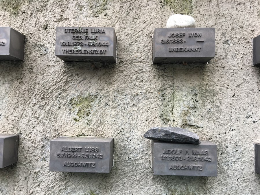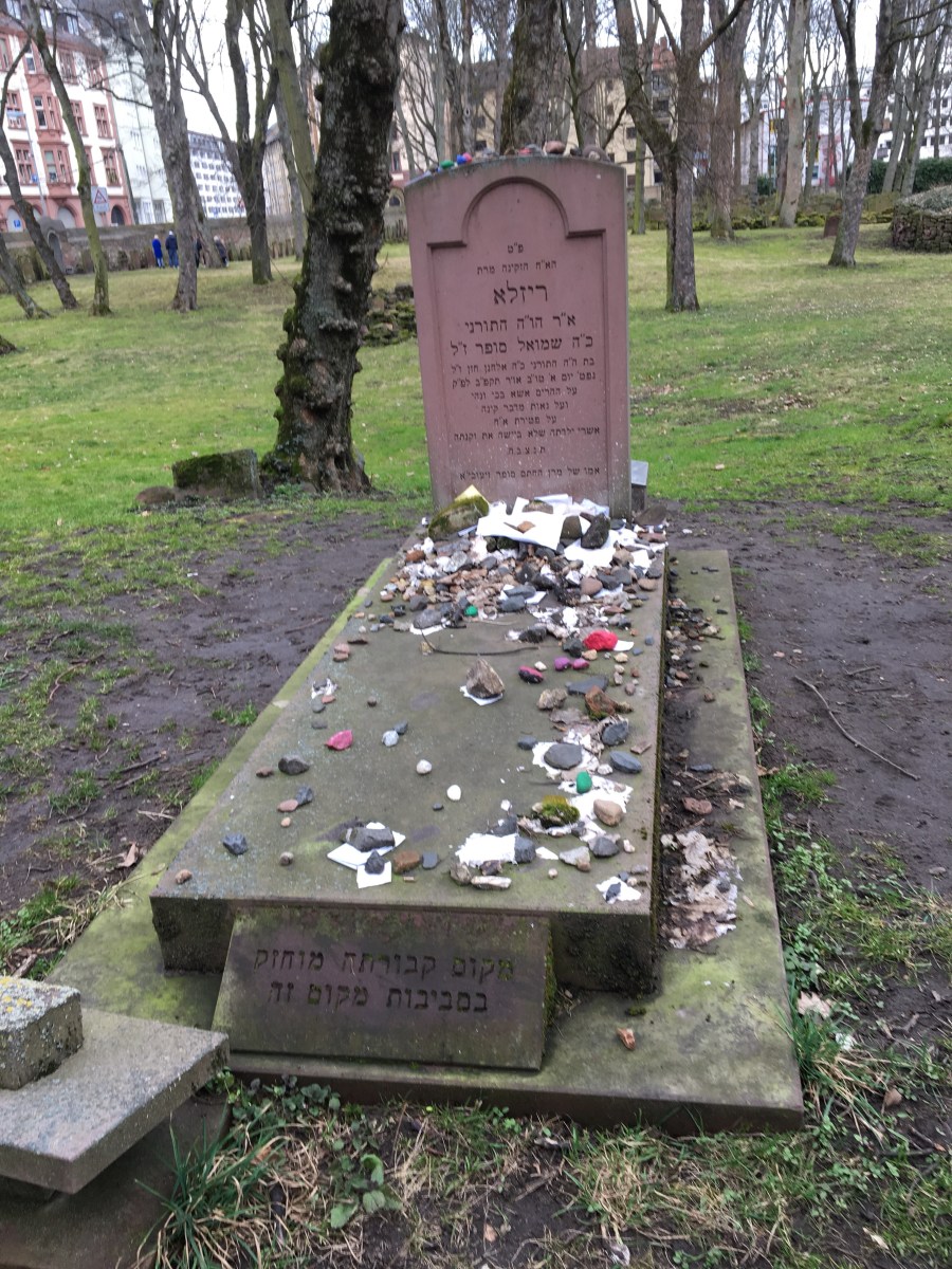 On Sunday Tamar and I took a tour of the old Jewish quarter which included a museum and cemetery. The first photo is a grove of trees pruned to have six branches representing a Star of David. The next photo is a section of the wall surrounding the cemetery which contains markers for every Jew from Frankfurt killed in the Holocaust. The first gravesite is for a woman who lived to be 103, died in the 1800’s. Supposedly she had five children after the age of 63. Women who are having difficulty getting pregnant come to her grave to pray. The other gravestone is for a man who had 28 combubines. The officials were going to castrate him but some of his mistresses were able to rescue him. The two photos from inside the museum are foundations of homes in the Jewish quarter reconstructed from some of the original stones and the stairwell down onto the mikvah(Jewish ritual bath).