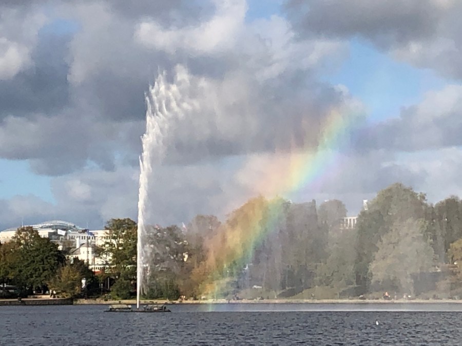 Today after breakfast we walked around Lake Alstar. It was very windy but not that cold. There were several sailboat regattas going on. We are lunch at a restaurant along the lake. Got to see all kinds of bird life and even a rainbow that was made in the fountain in the middle of the lake. I was of course sorry to see Tamar leave but I’m looking forward to going on to Norway tomorrow. Here are some pictures from our walk.