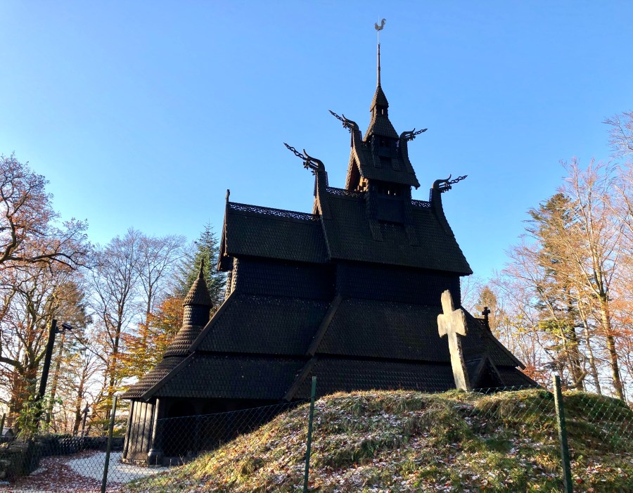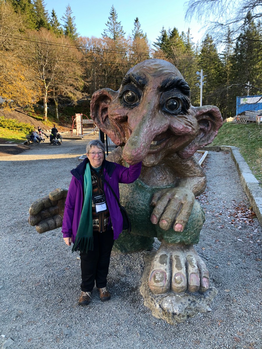 On Tuesday, we got a guided tour of Bergen. We saw some street art, visited a very old church, rode the vunicular up to one of the mountains surrounding Bergen. At the top, I had a picture taken of me and a droll.