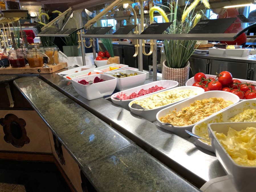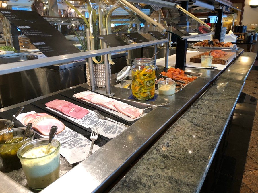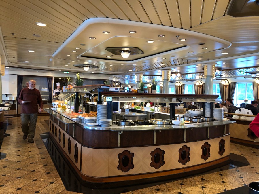 The food onboard is excellent. For breakfast and lunch we have a buffet. The buffet has more choices than you can imagine including smoked fish, meats, salads, cereal, yogurt, desserts, etc. For dinner, we have a fixed meal that consists of an appetizer, main course and dessert. Last night the main course was lamb and tonight it was the best tasting salmon I’ve ever had.  Here is some pictures taken of the buffet and what I had for lunch and dinner today. Tomorrow night we’re going to a Viking village and we are going to have a Viking feast.
