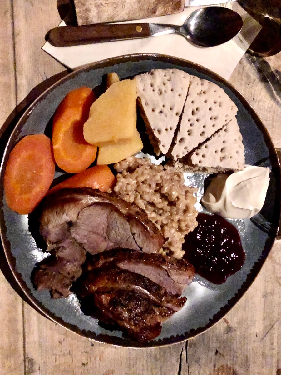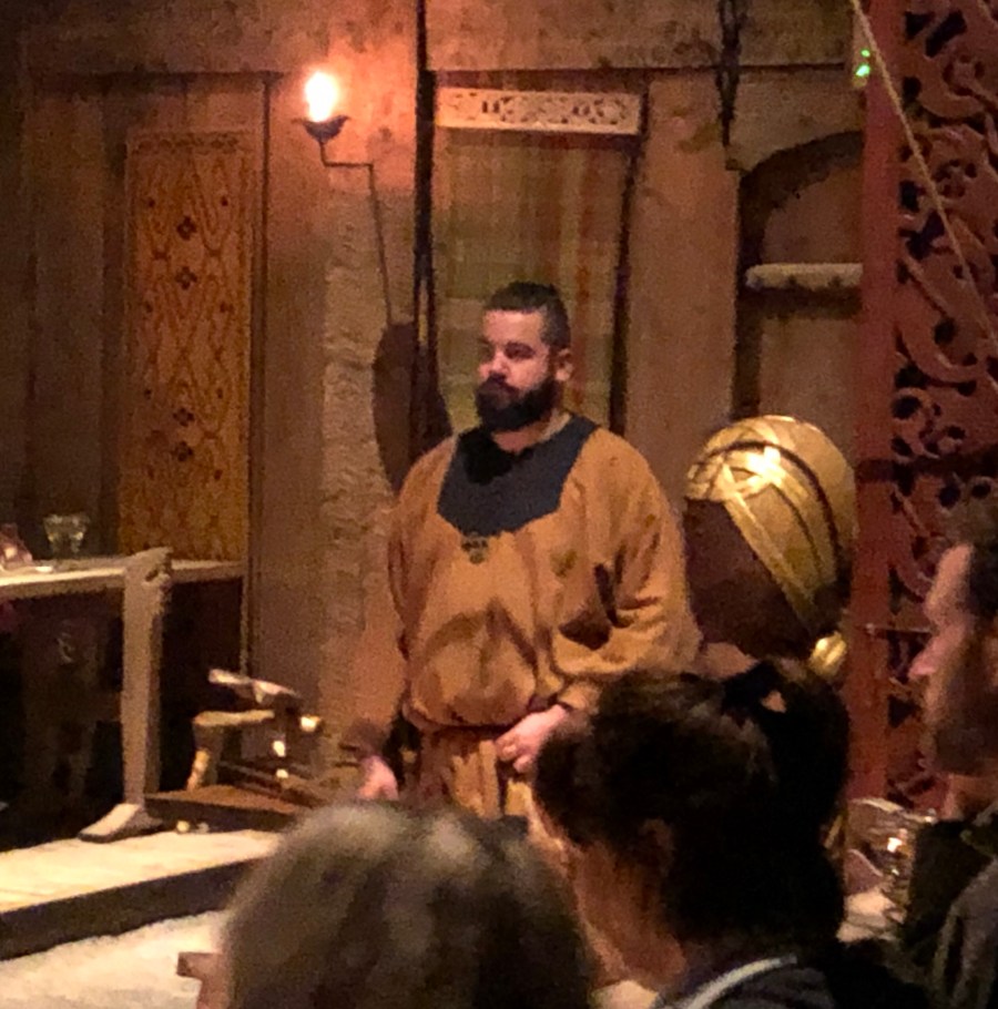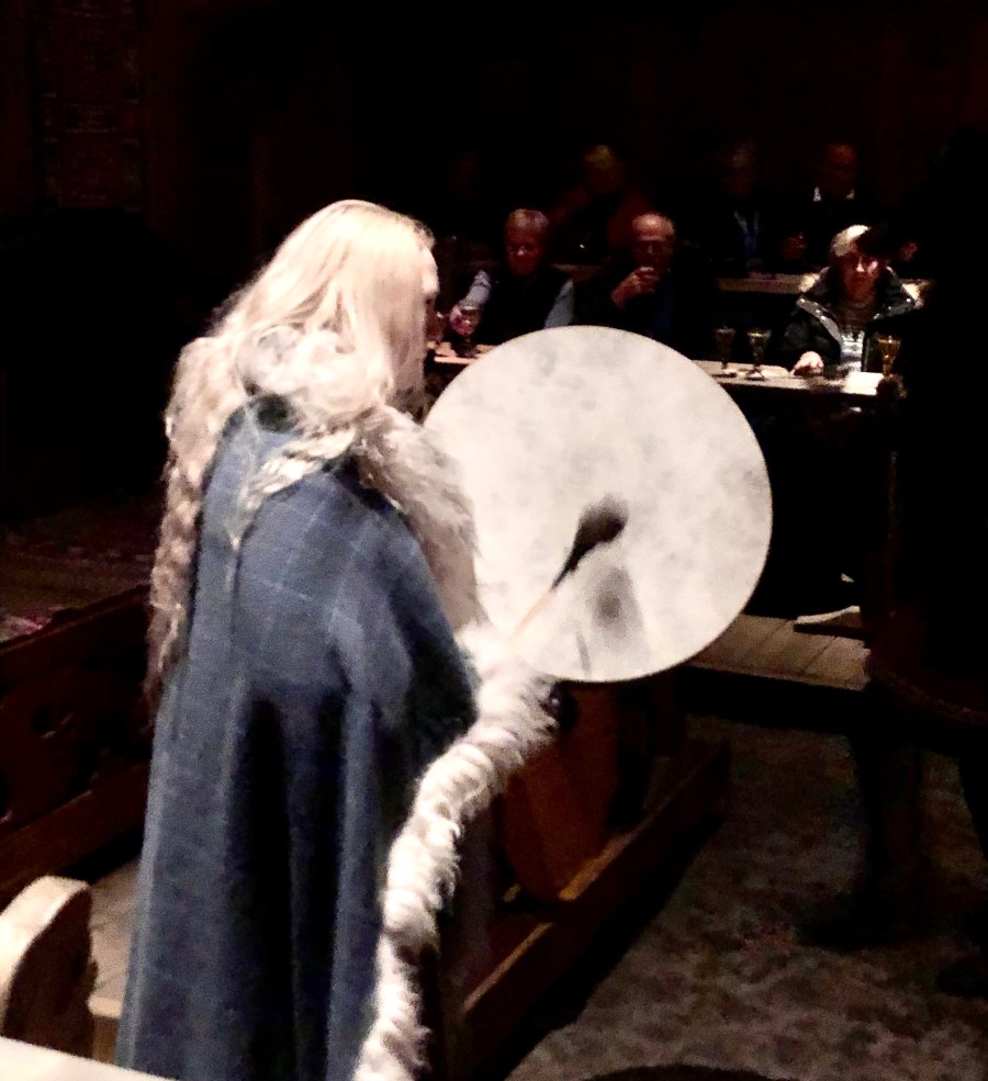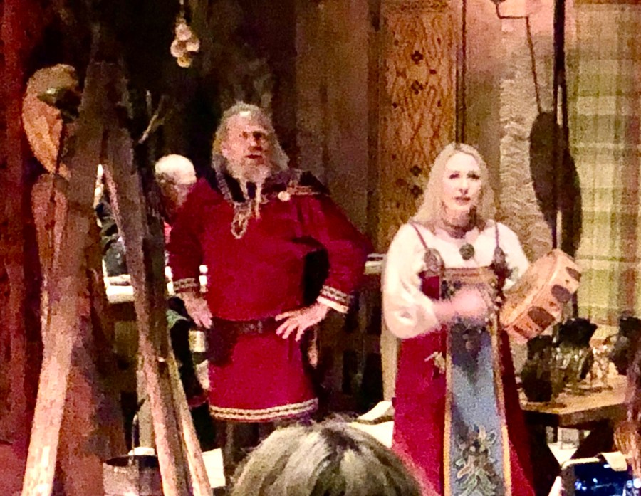 Last night we were in the Lofoten islands where we got off the boat in Stamsund, took a bus to a Viking feast and return to the boat in the town of Svolver. Learned a little bit about the Viking history and religion but I hope to learn more as the trip goes on. I did learn that the Vikings believe that there are many gods and that there are also these giants and other bad things and that the gods and the Giants fight each other and at some point humans will die off and then there’s going be a battle at the end of time between the Giants and the gods. Onto more pleasant things though. We had a feast in a Viking long hall that included a very healthy portion of lamb. There was some kind of ritual to appease the gods and there was singing and dancing. Also got to try honey mead which now I’m looking forward to having more of. it was hard to get good pictures because of where we were seated and the lighting in the hall.