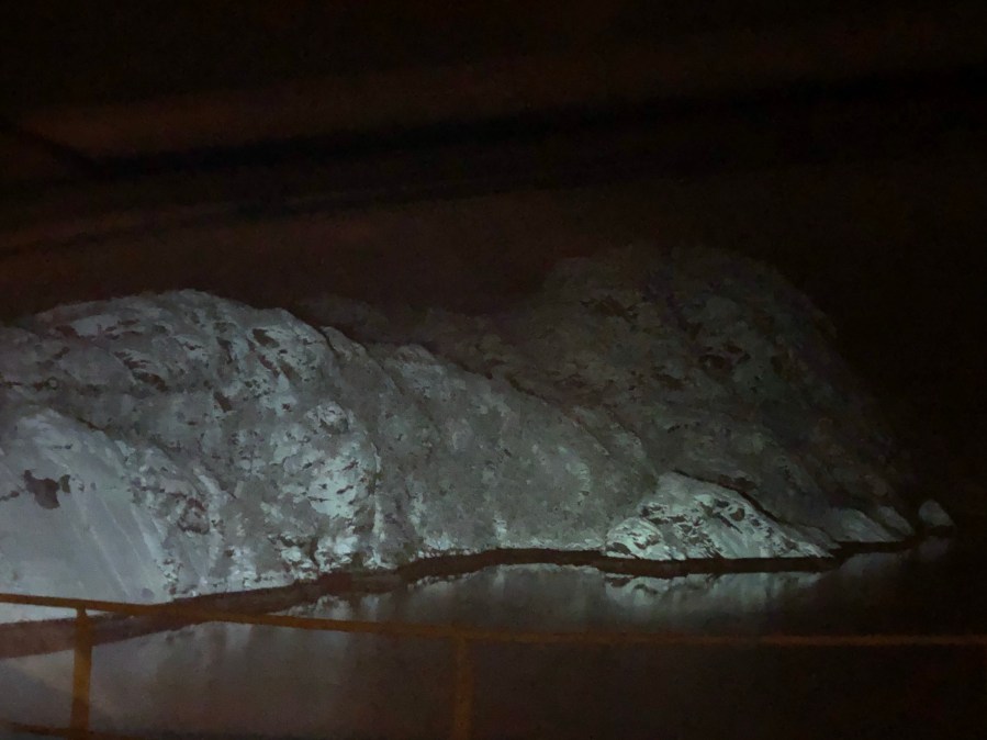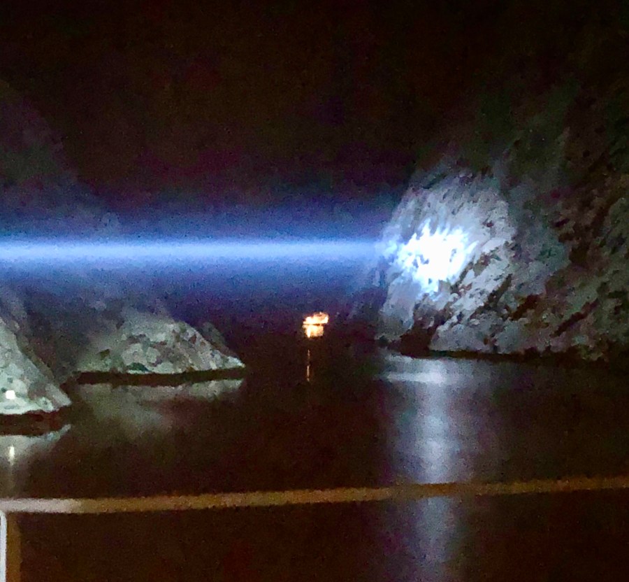 Upon returning, the ship headed to troll fjord. To celebrate they served troll soup which turned out to be somewhat of a mysterious thing. Some people thought it was some kind of fish soup but what I wound up having was some kind of fruit drink spiked with rum. It was very delicious and I got to keep the cup. The cup had a picture of a troll on it. Troll fjord is extremely narrow. The ship can only go in on a high tide. The schedule has them going in at around midnight so they light the walls of the fjord with big spotlights. Somehow they managed to turn around inside the fjord and come out. Unfortunately when we got there, it was not high tide so we just went up to the entrance and the captain lit up the entrance of the fjord.