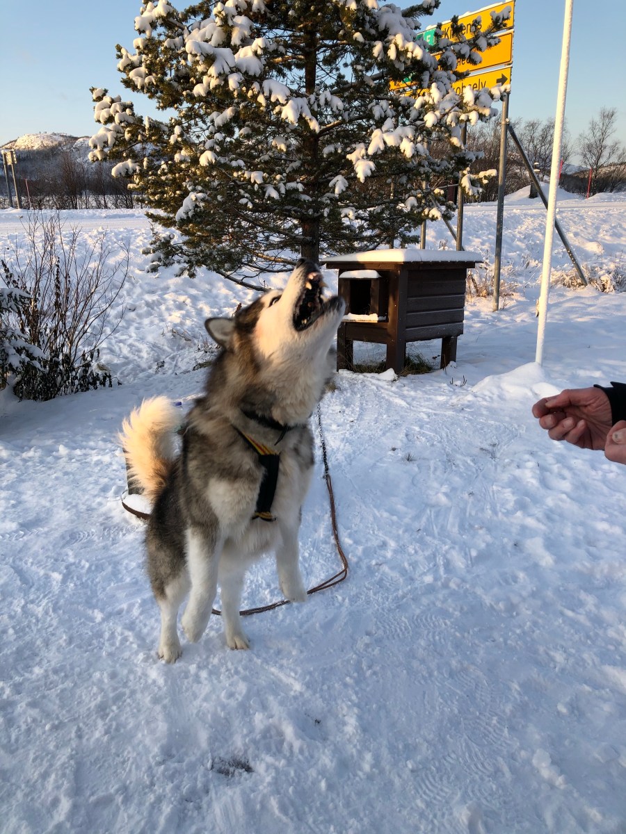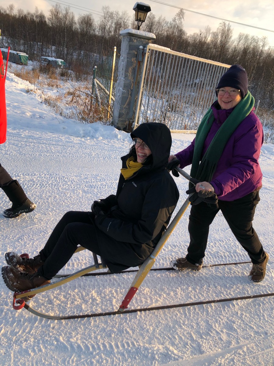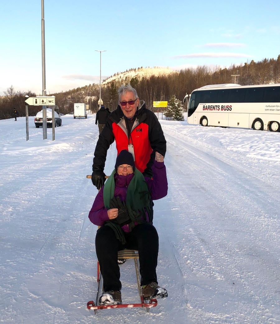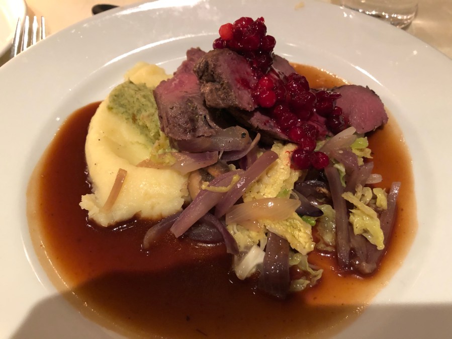 And Kirkenes, we got a bus tour up to the Russian border. We stopped for some wonderful borscht and bread, and we made some vista stops. I was surprised at the Russian border because we really basically didn’t see any soldiers. It’s a fairly open border where residents living within a certain distance of the border can cross back-and-forth at any time. The Norwegians go over to Russia to buy cheap gas. There are many Russian workers in Norway. The Russians are very welcome in Norway because they spend a lot of money. At the border we had some fun playing with a sled. I got to push the road scholar group leader around on one. At the border was also a little gift shop that the guide was calling a shopping mall. It had Russian souvenirs in it. There was also a beautiful friendly husky outside. When we returned, we were treated to a wonderful Arctic Circle dinner featuring reindeer.