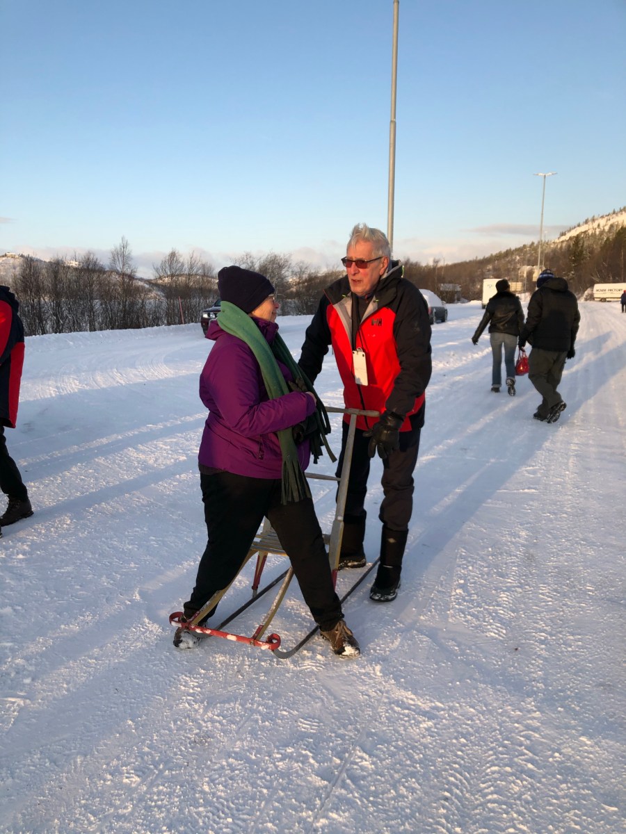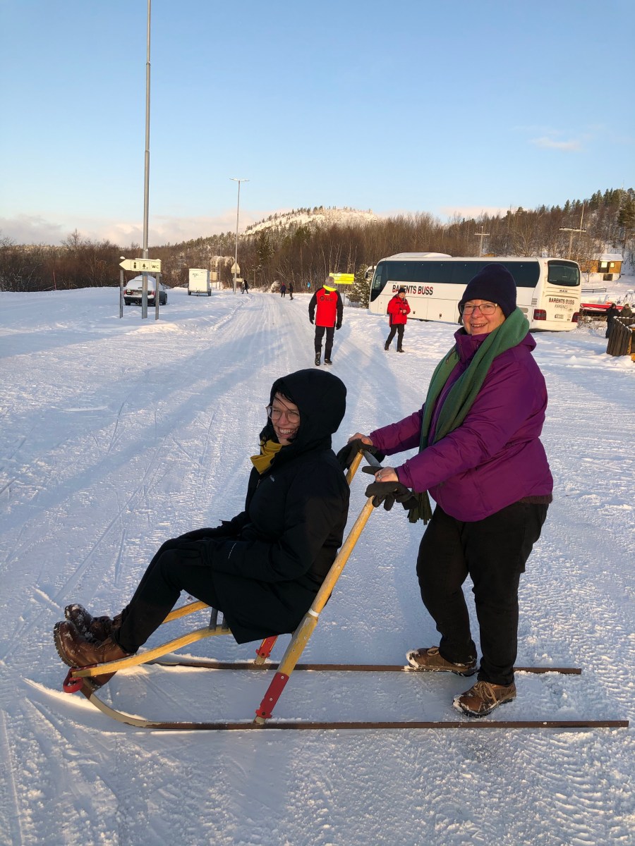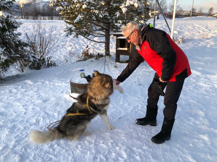 And Kirkenes, we got a bus tour up to the Russian border. We stopped for some wonderful borscht and bread, and we made some vista stops. I was surprised at the Russian border because we really basically didn’t see any soldiers. It’s a fairly open border where residents living within a certain distance of the border can cross back-and-forth at any time. The Norwegians go over to Russia to buy cheap gas. There are many Russian workers in Norway. The Russians are very welcome in Norway because they spend a lot of money. At the border we had some fun playing with a sled. I got to push the road scholar group leader around on one. At the border was also a little gift shop that the guide was calling a shopping mall. It had Russian souvenirs in it. There was also a beautiful friendly husky outside. When we returned, we were treated to a wonderful Arctic Circle dinner featuring reindeer.