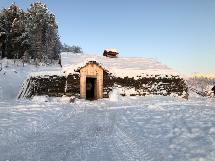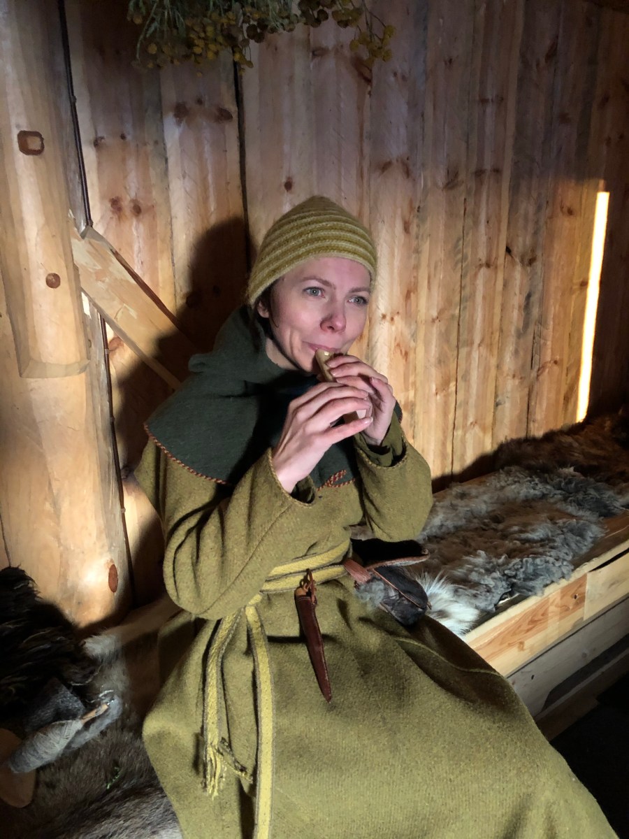 After being up to almost 2 o’clock because of the concert, we had to be on the bus the next morning at 8 o’clock for a tour of the Lofoten islands. We got off the ship at the town of Harstad and met up again with the ship after 4 1/2 hours in the town of Sortland. The first stop on the tour was an old Romanesque style church with an adjacent museum and a farm from the 13th century. The church had walls that were 2 meters thick. The farmhouse was a wood structure covered with sod for insulation. In the house a woman was sitting spinning yarn. I got to talking to her and she pulled out this little flute and played a song from the 12th century for me. The flute was made out of the thigh bone of a sheep.