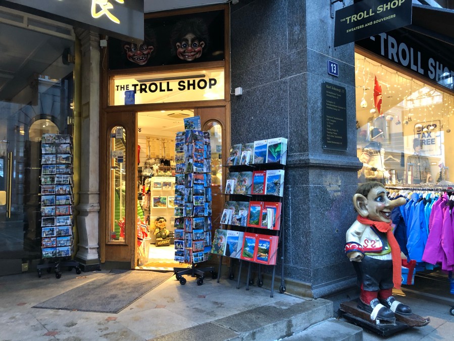 After lunch we went downtown to explore and do some shopping. Elaine wanted to go to the troll store. Trolls play a very important part in Norwegian lore. The following pictures are taken of street scenes during all three days that we’ve been here. In spite of all the new construction, there are some nice older buildings. The architecture is quite varied.