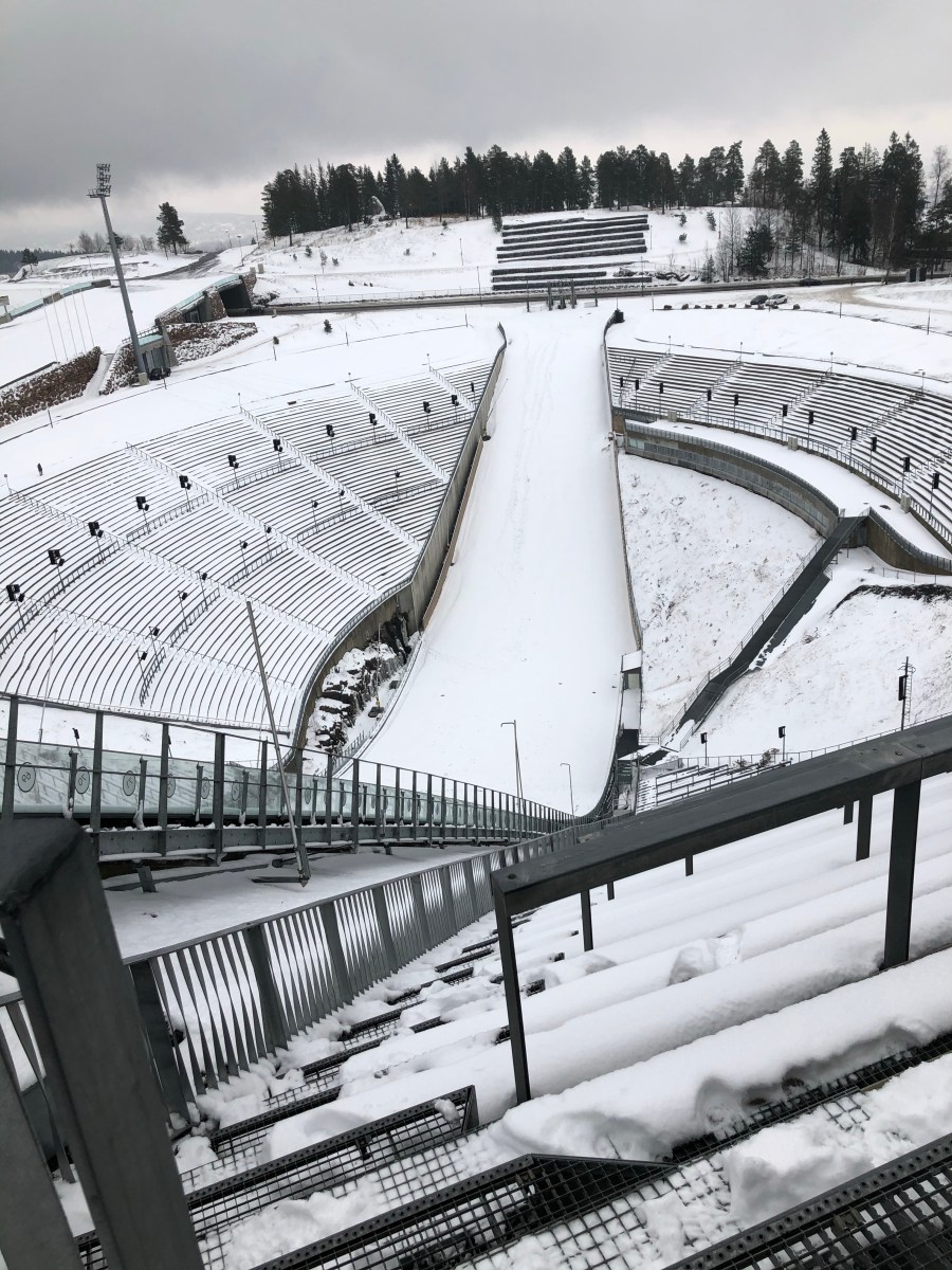 Today we decided to take a guided tour. We went to four different locations. First the bus drove around the central area with a guide giving us some information about Oslo. It turns out that Norway was not a fully independent country until 1905. It had a constitution signed in 1814 but was forced into a union with Sweden which lasted until 1905. our first stop on the tour was to a ski jump and Nordic competition area. I have never been near an actual Olympic level Skijump. I have to admit it is very impressive. Being up close to it makes me wonder what kind of crazy people actually go down these things. I’m going to have to apologize for most of my pictures. Either we were outside where the weather was dismal, gray or we were inside and the lighting wasn’t that great.