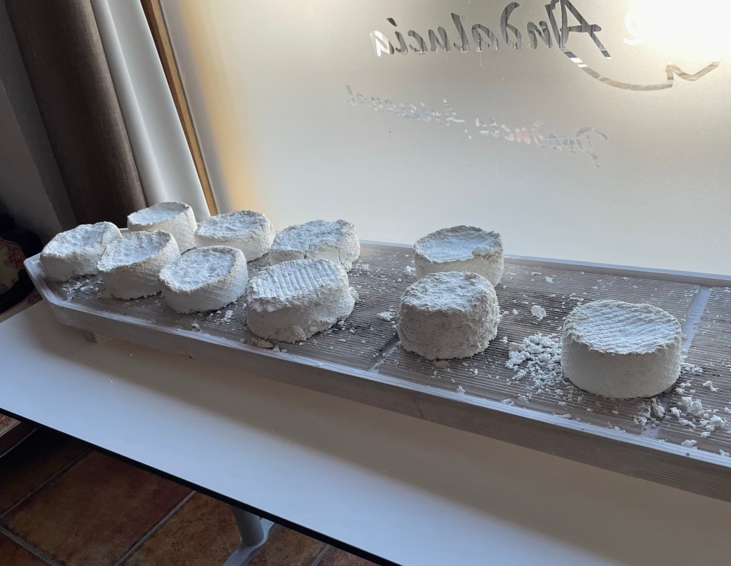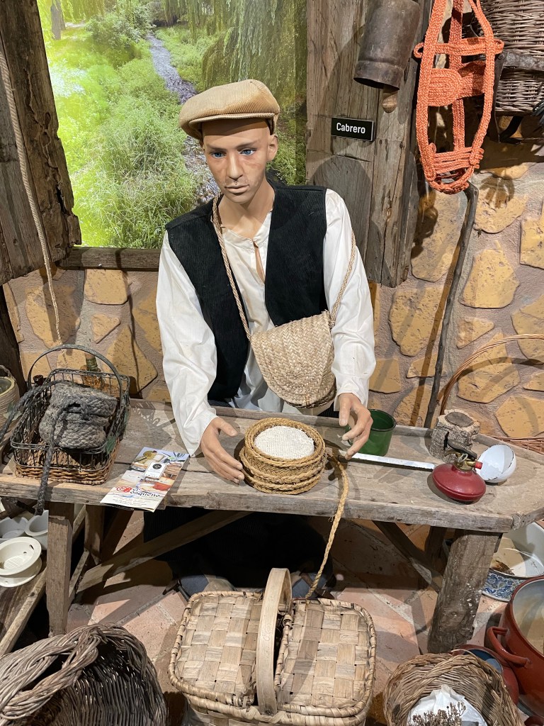 Our next stop was the village of Zahara de la Sierra where we learned about cheese making both the old way and the new. We got to taste some excellent samples of their cheese. Here are two pictures, one is a diorama of how they made the cheese in the past and the other is some recently made blocks of cheese.