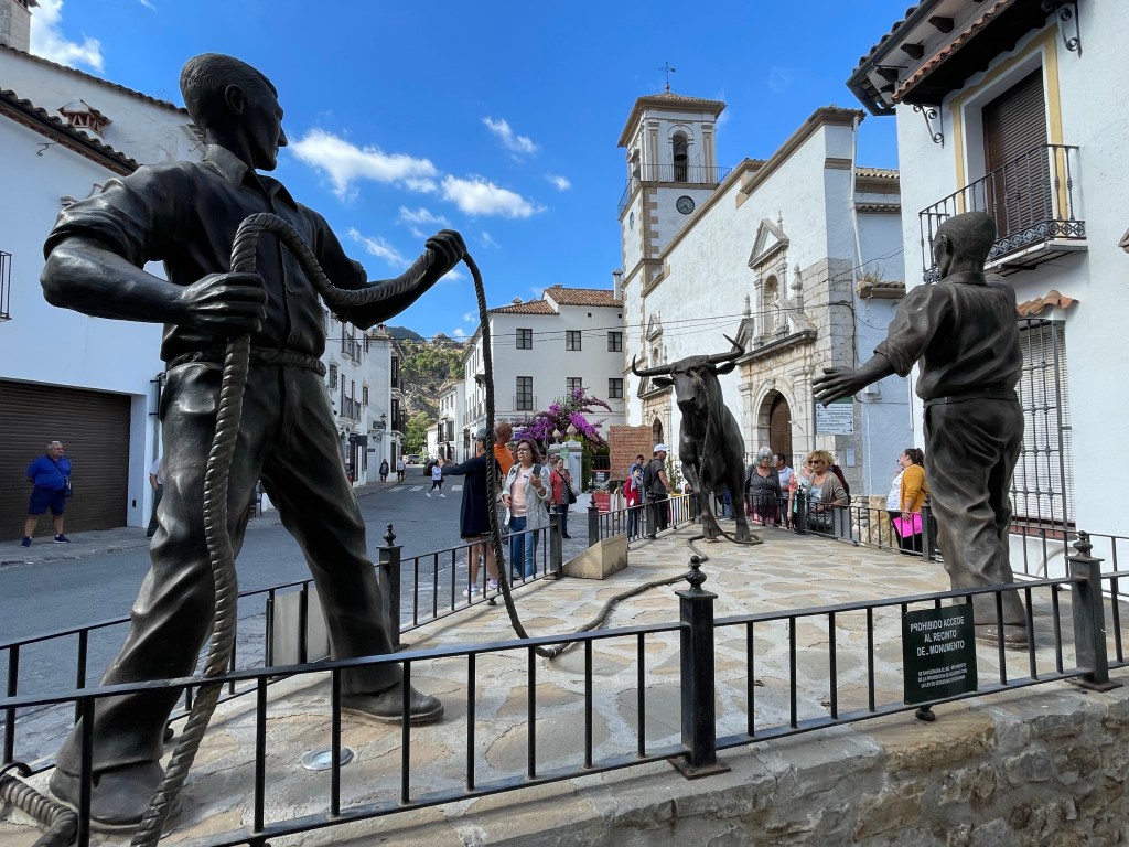 Statue of men leading the bull to the town’s bull run.