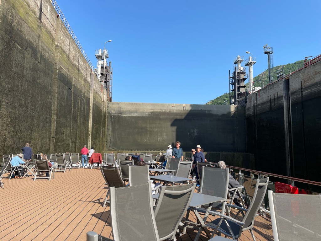 It was nice to actually spend the morning on the ship. Of course we were going through some spectacular scenery. The upper deck is very pleasant to be on. It has a herb garden for the chefs, a small miniature golf course and shuffleboard.