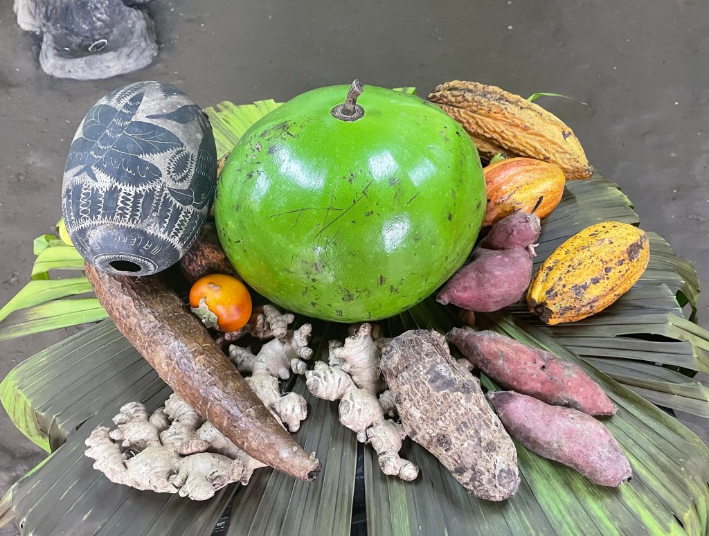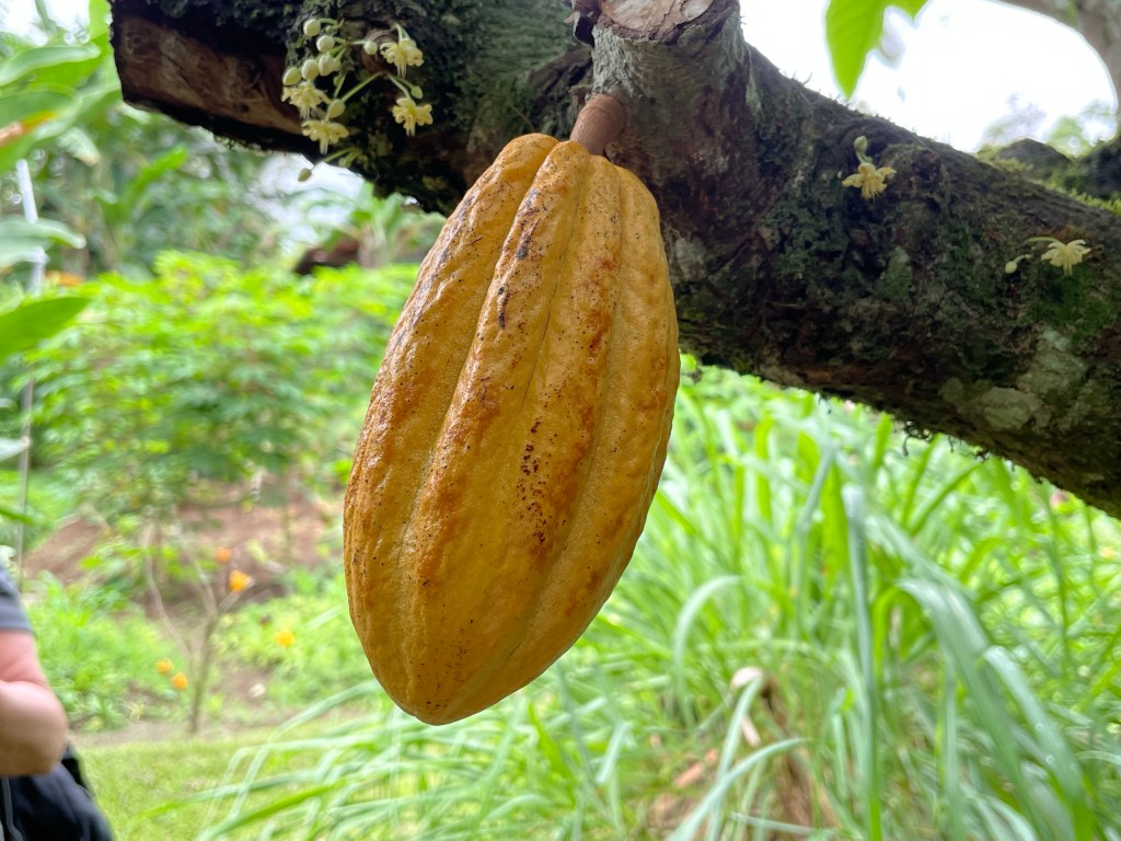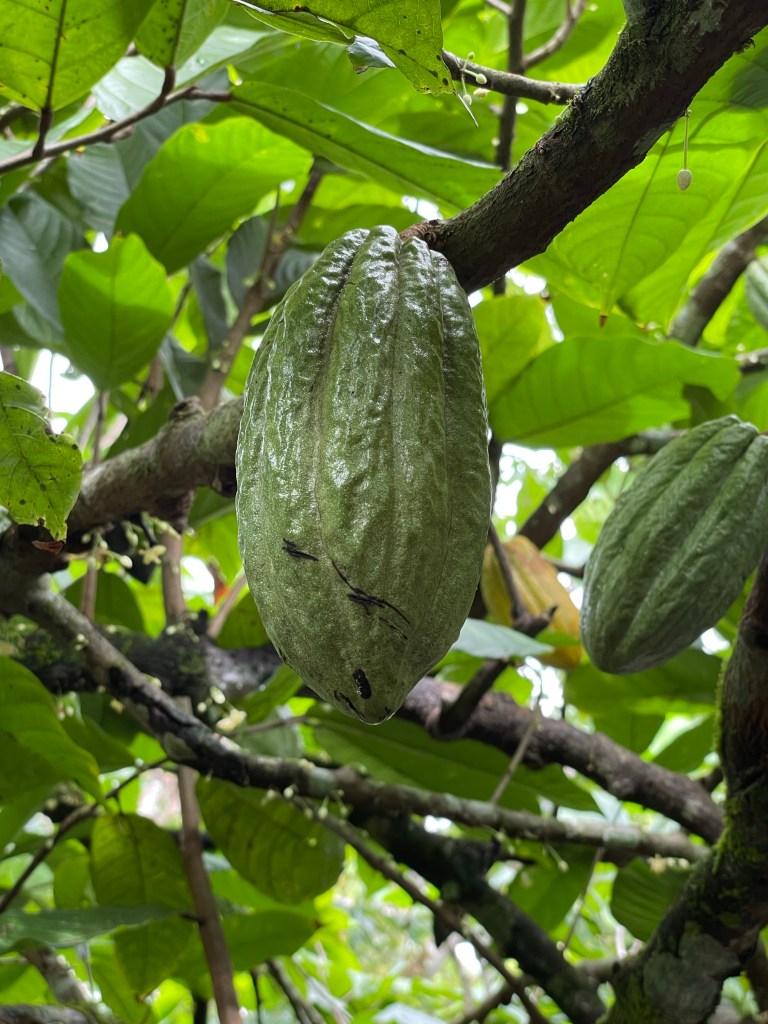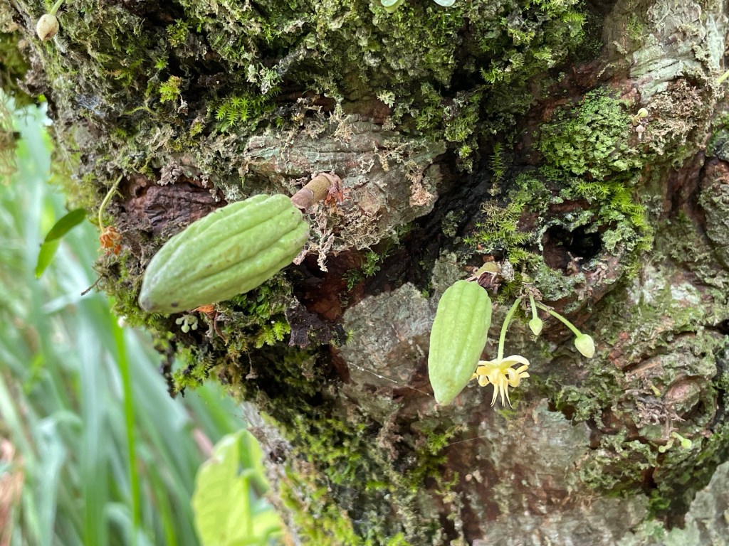 The next set of pictures are of cacao, unripe fruit, the flowers which are pollinated by mosquitoes, baby fruit and a ripe fruit.