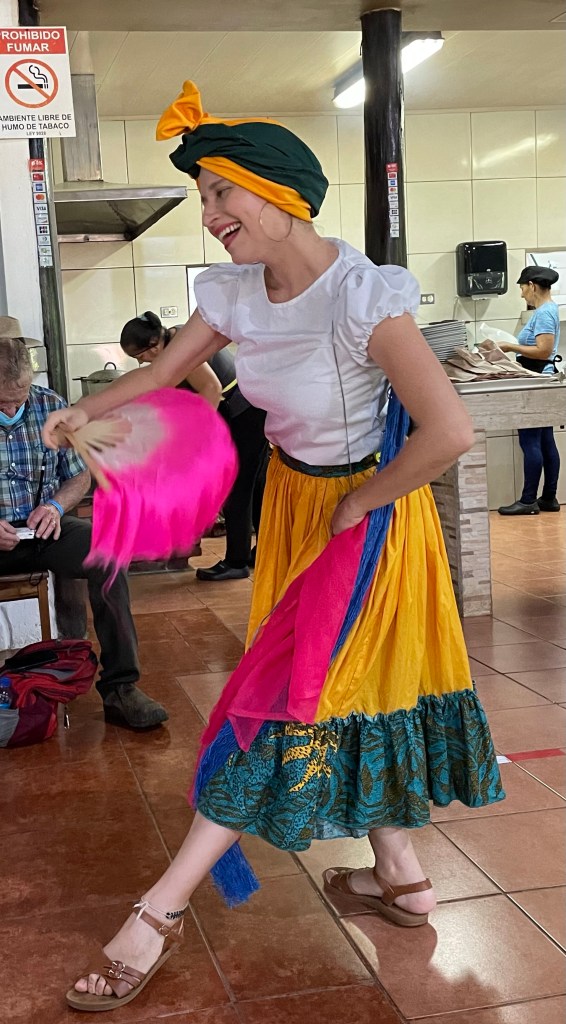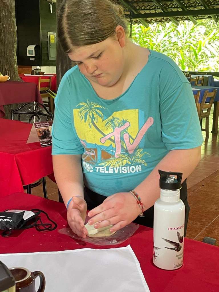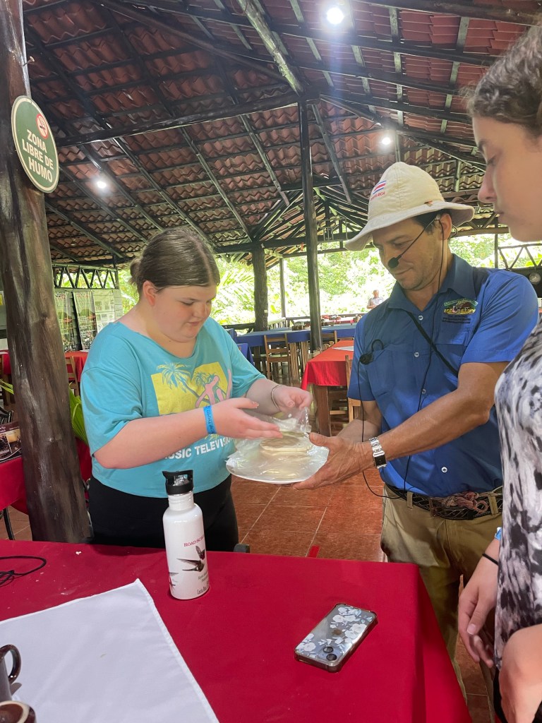 Today’s single activity consisted of visiting a family run farm. This farm is only 8 acres. They practice sustainable farming. Many people in this area have developed Eco tourism as a way of making a living. This is one good example of this. Other examples that we have already experienced are the chocolate farm and our cooking adventure. Our activities at this farm included a tour of what they grow, a demonstration of folk dancing, learning about sugar production, making tortillas and finally eating lunch.The first set of pictures are just of some flowers on the farm. Costa Rica is so incredibly lush with an amazing variety of plants.
