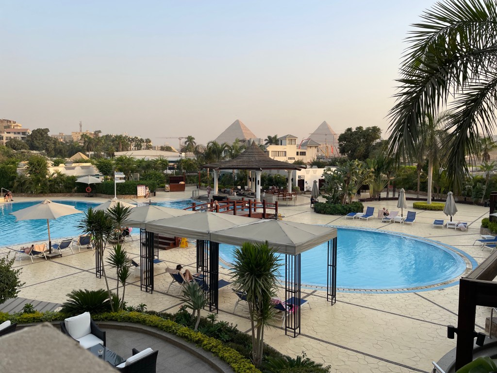 After a wonderful stay in Boston, and a pretty uneventful flight to Egypt, I am in a five-star hotel in Giza. Below is a picture of the view from my room. I actually went swimming this afternoon. The pyramids are in the background of this picture. Even though the room is wonderful, I am disappointed in the food. It looks interesting but it’s not cooked very well. Tonight they had duck that was so tough, I didn’t eat all of it. They had lamb cooked in coconut milk, which was so bland it was totally uninteresting. I have, however had some really incredible appetizers. Desserts are also always good. I might just eat a dinner entirely of appetizers and dessert.