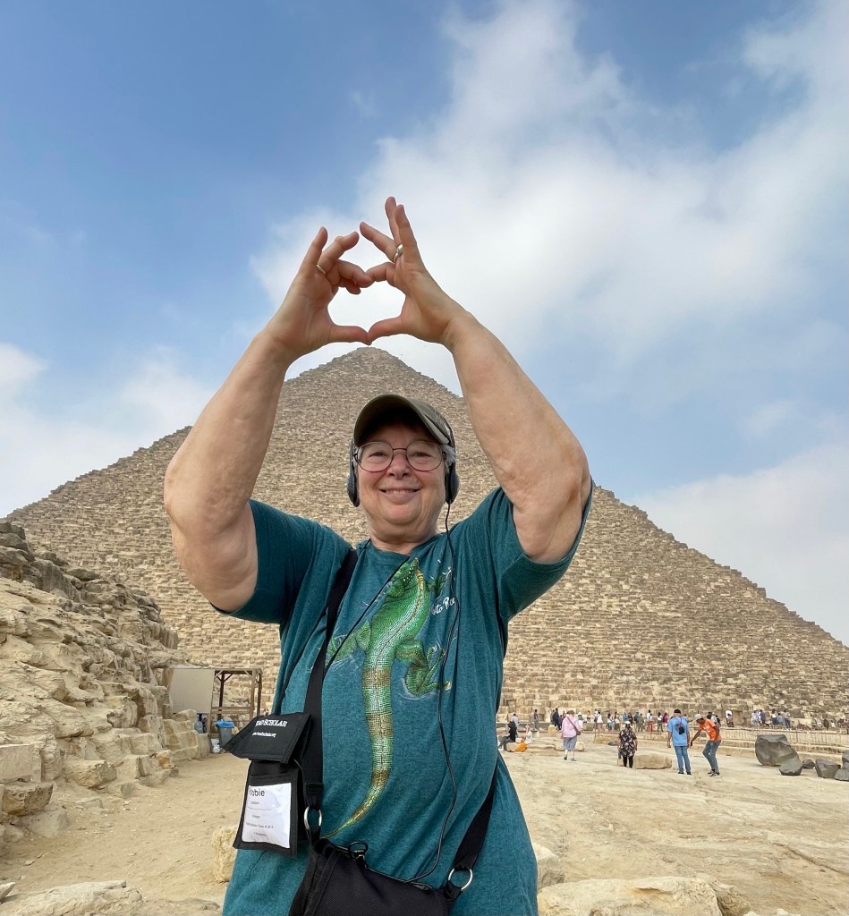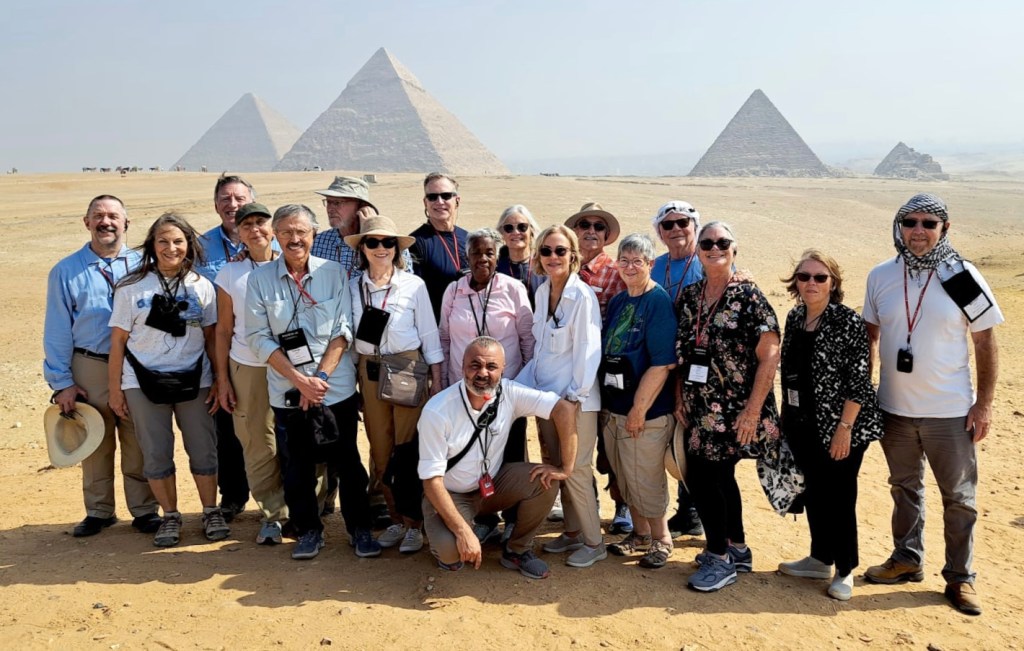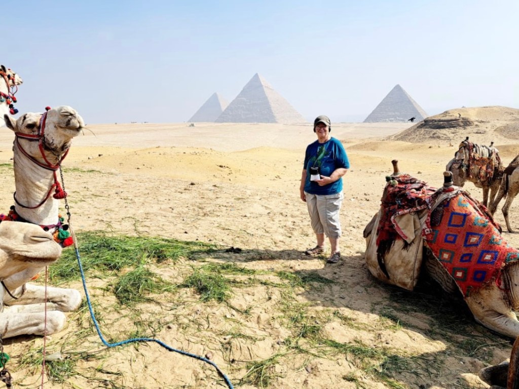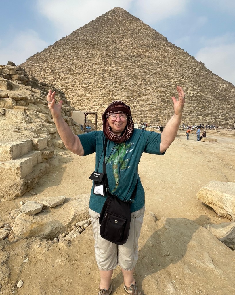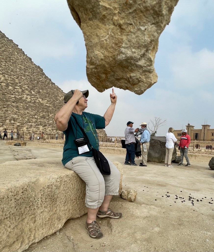 Our first day consisted of two major outings, one to the pyramids and the other to the Egyptian museum. We walked around the big pyramid, and also the Sphinx. The group took a camel ride which I had to turn down because of the arthritis in my hips. I got up onto the camel and decided that was a bad thing for me and my arthritis so I immediately got off. The group only went for about a 15 minute ride so I’m actually glad I didn’t go. When Janet and I were here in 2001 we rode around the pyramids for at least an hour on a camel. Here are the pictures from around the pyramids. The pyramids were constructed during the old kingdom dating from 2700 to 2160 BCE.