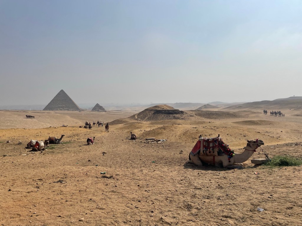 The terrain around the pyramids, including a camel in the foreground
