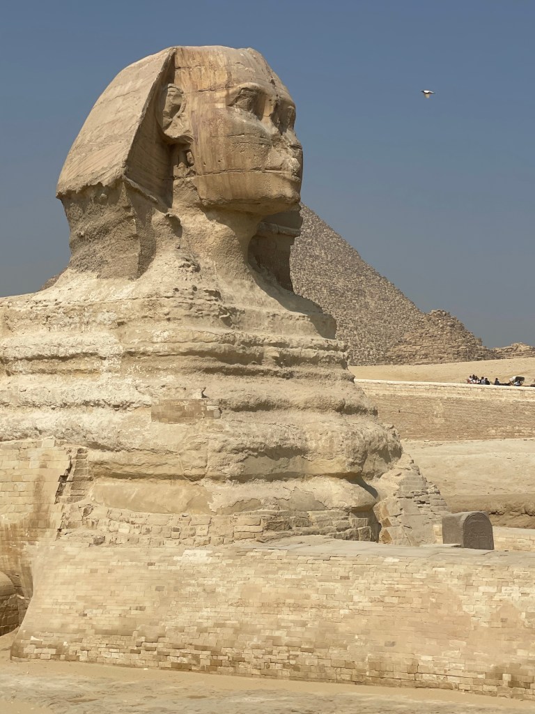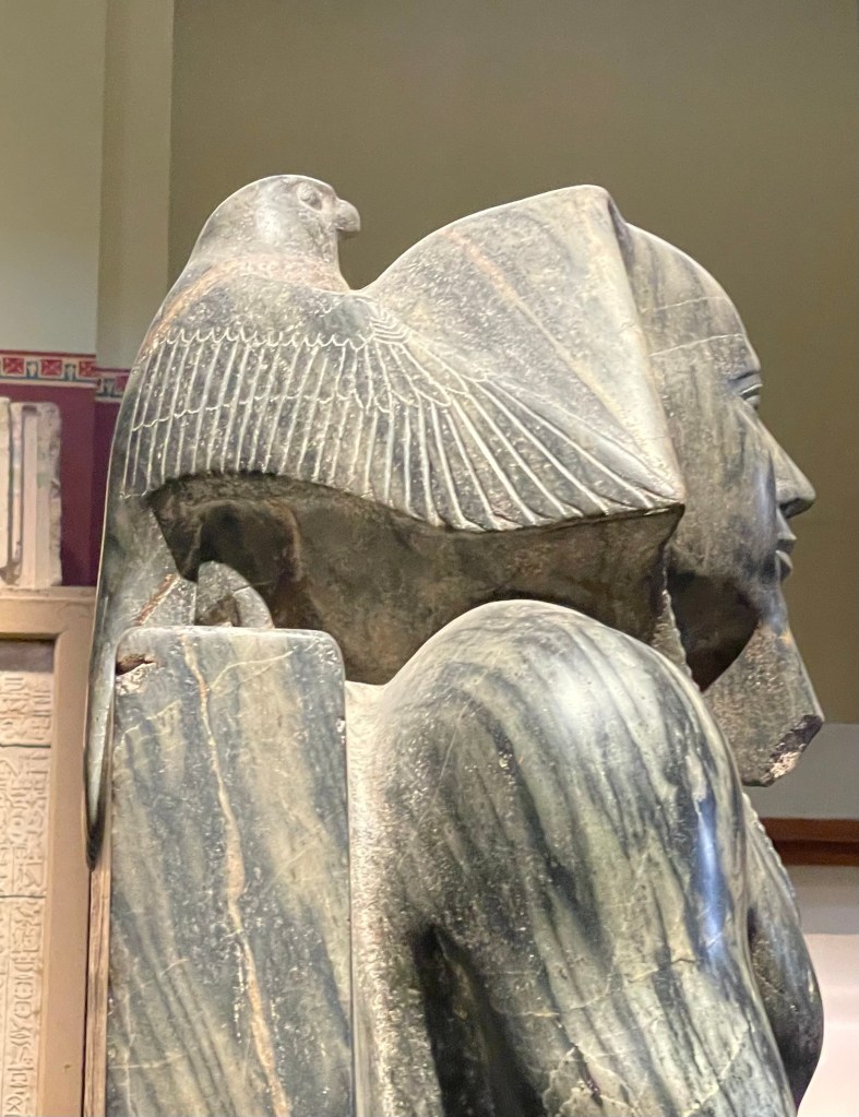 the most iconic sculptures of ancient Egypt. One of the interesting things about it is the use of the falcon god Horus to support the neck of the king.
