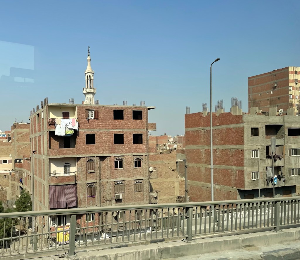 Typical building in the poor part of Cairo. Notice some of the apartments aren’t even completed. Some are obviously occupied. The state lets people get away with it because their taxes are lower if the building is not complete. The state knows that these people are having financial difficulties. In spite of the obvious poverty, most of the buildings have significant numbers of television receptor disks on the roofs.
