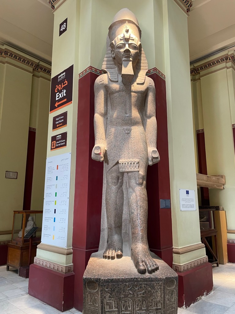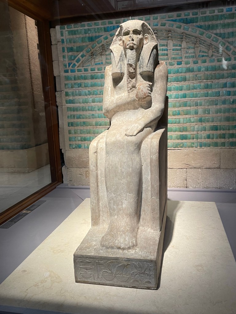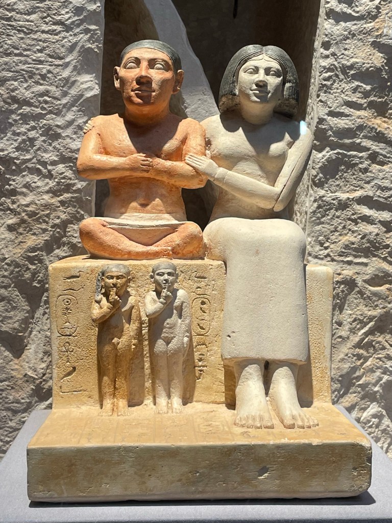 We learned why most Egyptian statues have the left foot forward. It is because it means that the person is still alive. The heart is on the left side of the body so a forward left foot means a living person. A forward right foot means a dead person. Feet together means they’re in the afterlife.