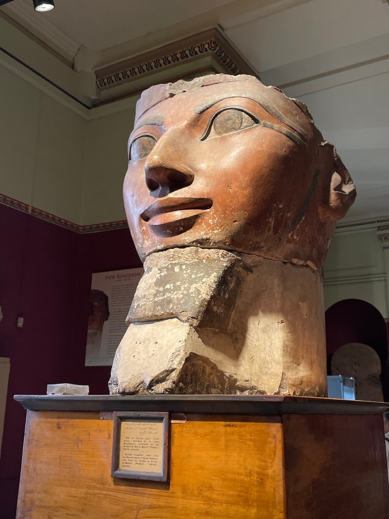 Painted limestone head from an Osiride statue of Queen Hatshep-sut, from her temple at El-Deir el Bahari.