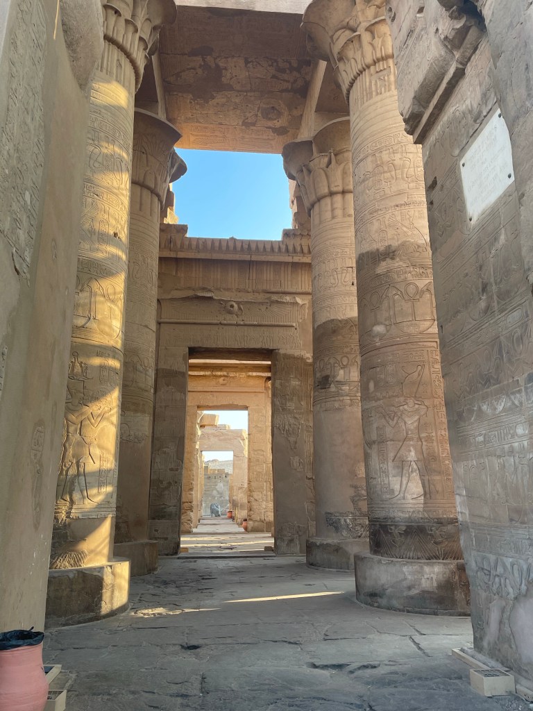 The first temple we visited, was the well preserved Kom Ombo Temple. Built during the Ptolemaic dynasty in the second century BCE, this temple is highly unusual, because of its symmetrical, double design. All the rooms of the temple are duplicated, mirrored among the building’s main access. The southern half of the building was dedicated to the crocodile god Sobek while the northern part of the building was dedicated to falcon god Horus. During initial evacuations, over 300 crocodile mummies were discovered at this site.