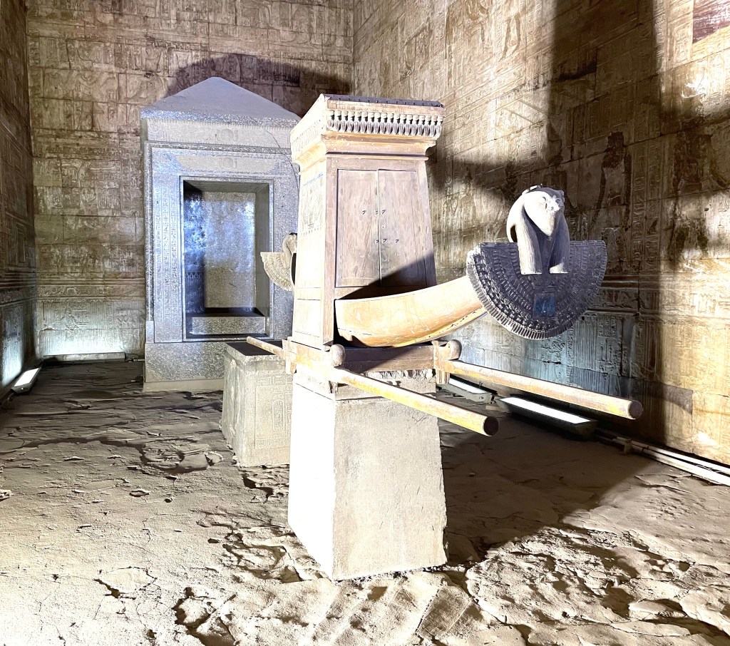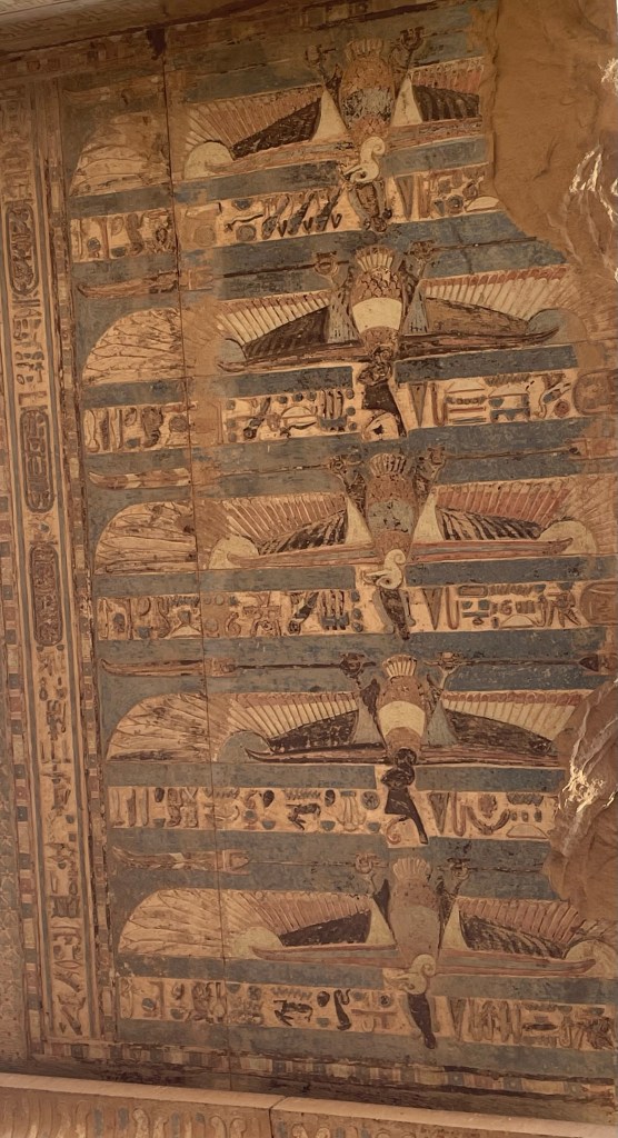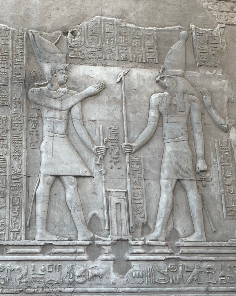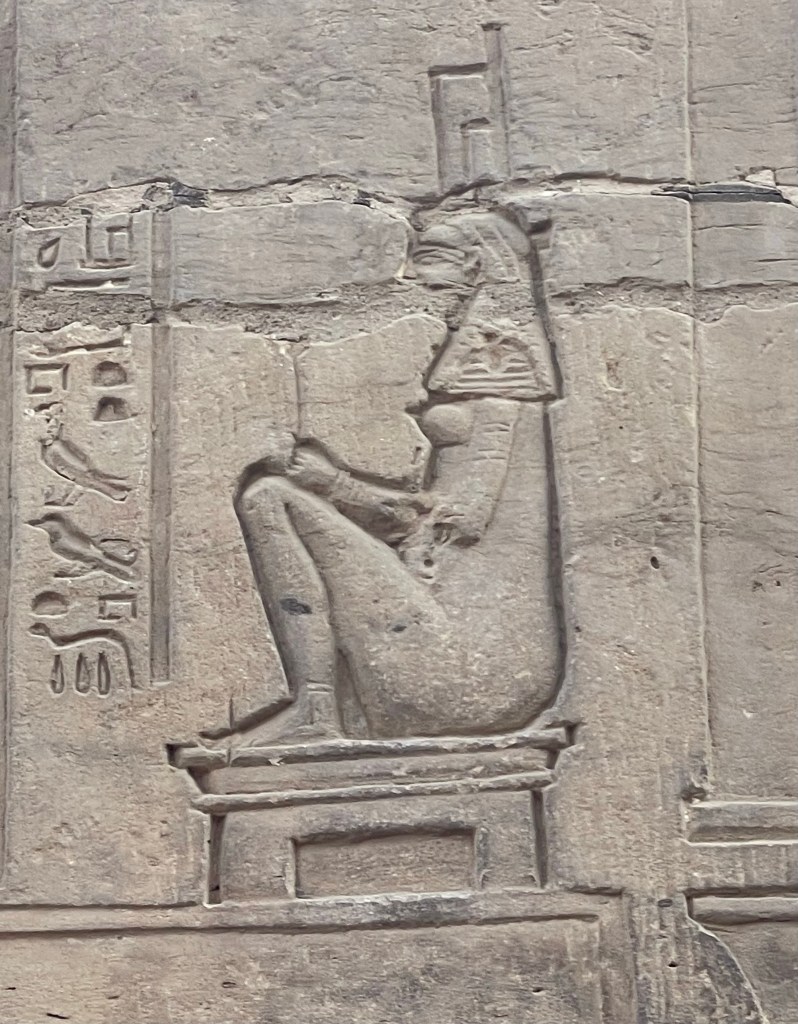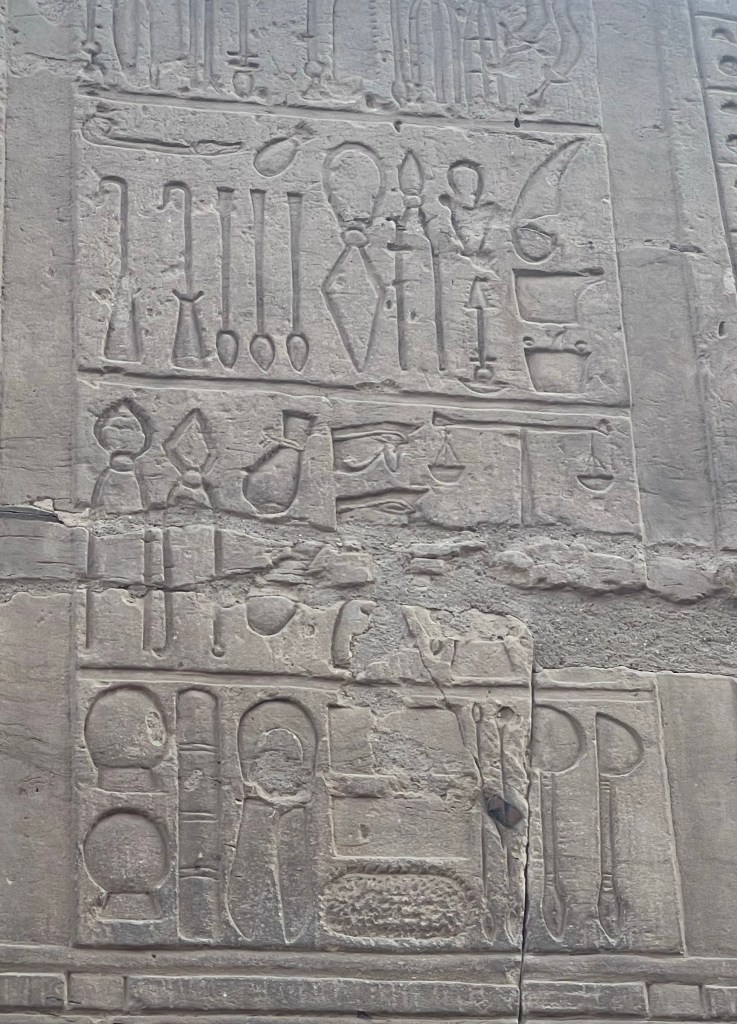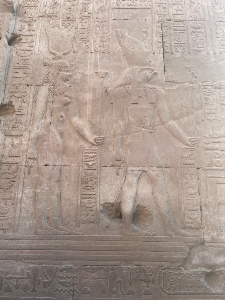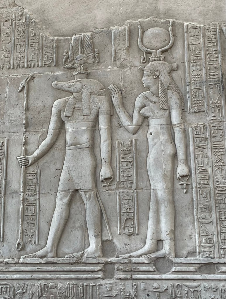 Goddess Hathour on the left, and Horus on the right.This unique scene was most likely carved between the reigns of Roman emperors, Antonius Pius, and Macrinus (138-218 CE). . The depicted medical and surgical instruments include scapels, hooks, forceps, scales, a sponge and various vessels.Isis sitting on birthing stoolColorful ceiling Hathour on left, Atoum in the middle. Unfortunately I don’t know. The name of the god on the right. Since the temple was built during Greek time, you can see the influence on the sculptures compared to older Egyptian temples.Sobek and HathourAtoum and Horus