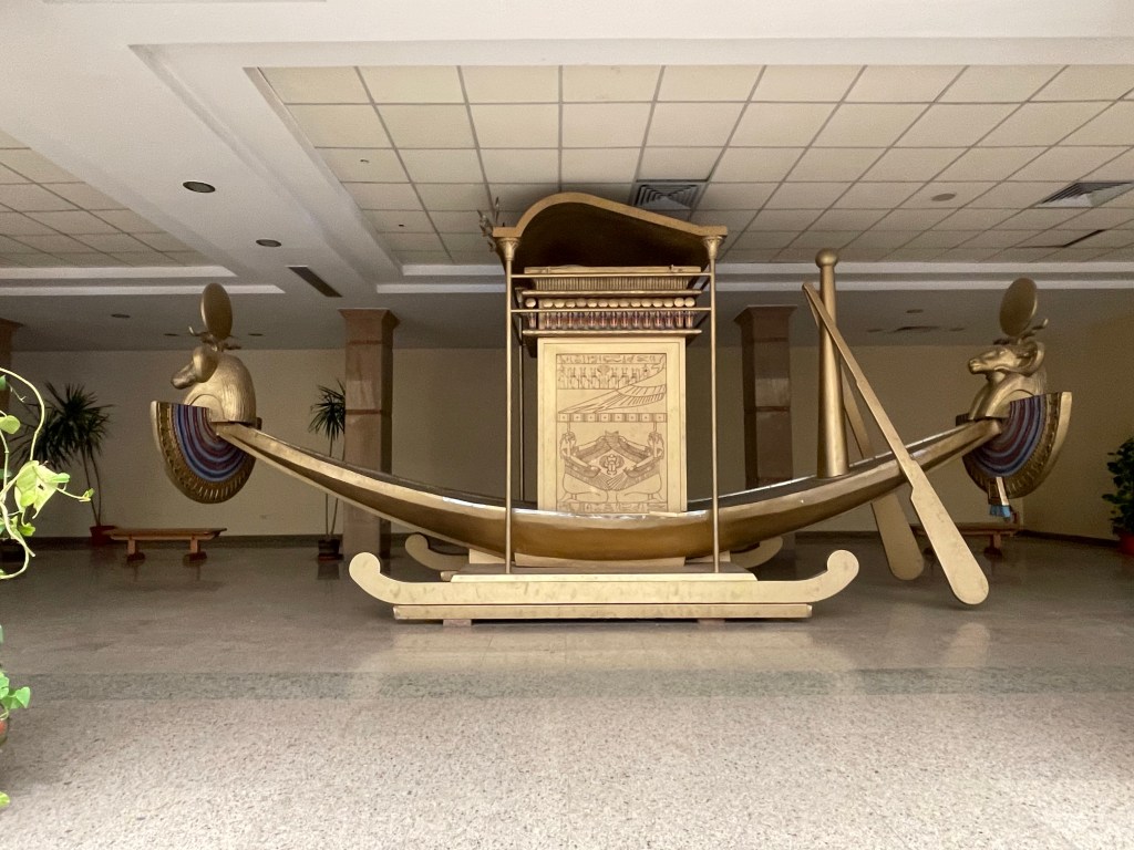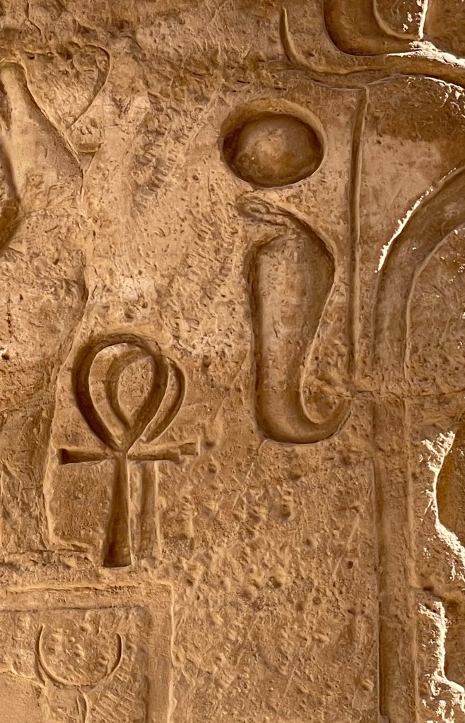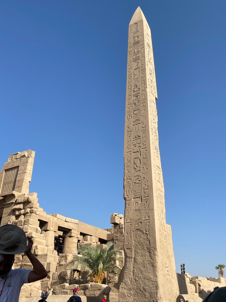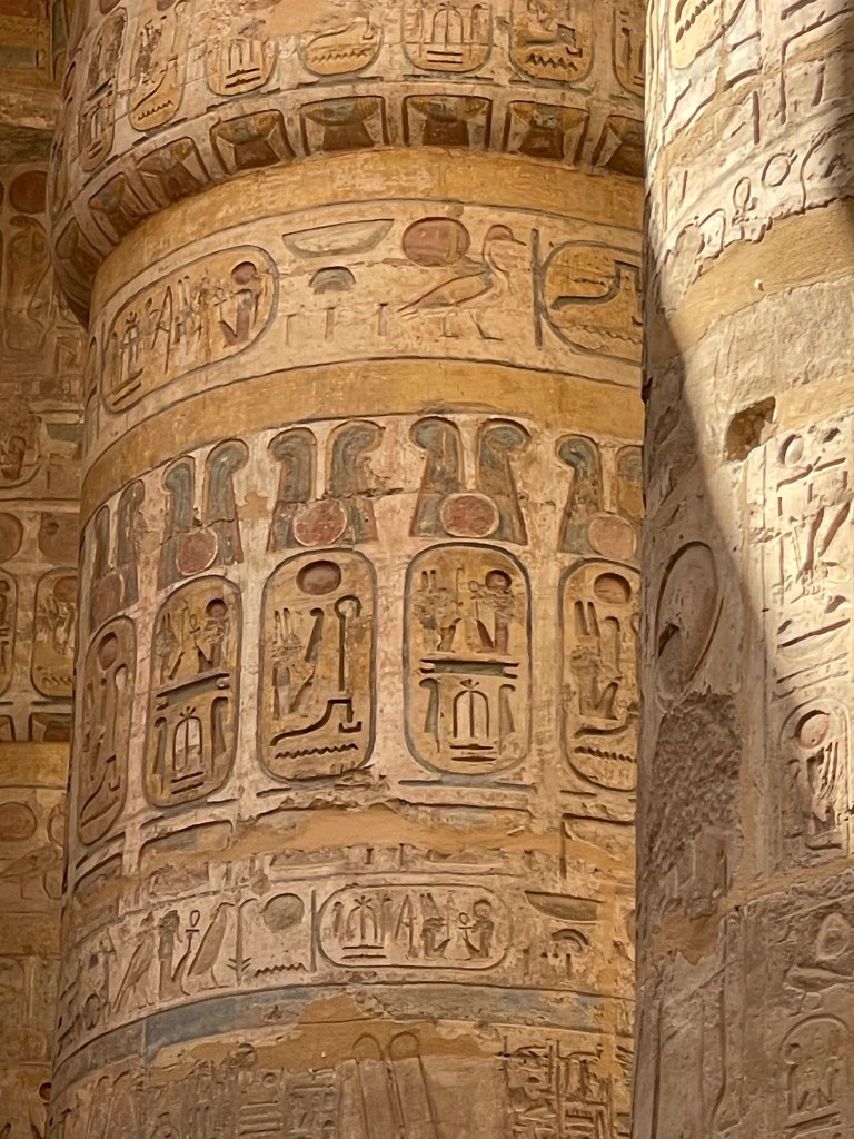 Model of a boat that is envisioned to carry the pharaohs to the afterlife.Karnak Temple complex Amun in animal form as a ram, father of the godsImage of King TutRemnants of the ramp used to construct the temple. Experts believe similar ramps, were used to build the pyramids.This hall in Karnak temple contains 134 columns, the most columns of any place on earth.Ankh (life), the cobra (protection) and circle sun god Ra Amun with an erect penis. He impregnated a whole village and was punished by having one leg and one arm cut off. From this came the idea that a bull symbolizes the god of fertility.An obelisk represents a ray of the sunOriginally three gods. When the Christians came, they destroyed the god to the left, and the right to make one god a figure of the cross.Well preserved hieroglyphics. They are doing work restoring much of the art in the temple.