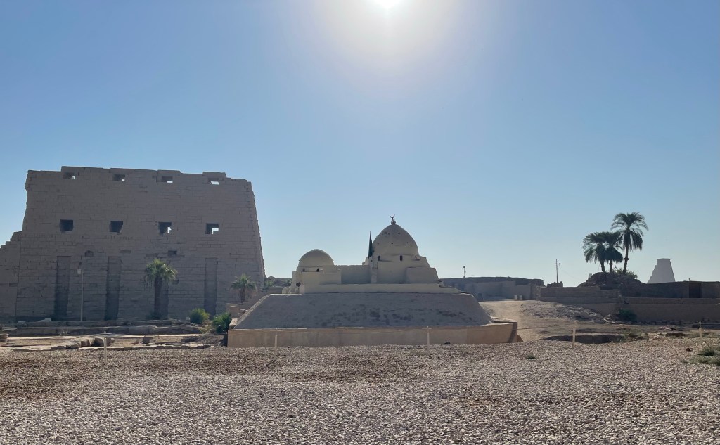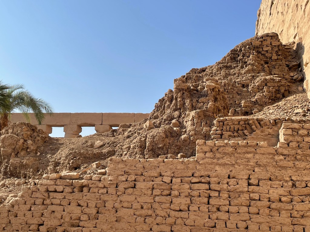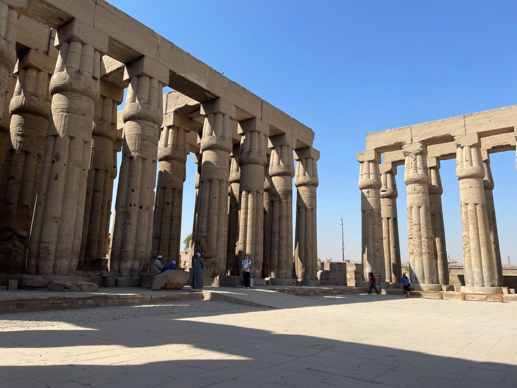 The temples were once connected by a 2 km road. Restoration of the road is in the works.Temple dedicated to goddess Mut Ramses with the double crown, representing both lower and upper EgyptMosque built into the upper floors of the templeTwo figures of God, Hapi, representing upper and lower Egypt, tying lotus and papyrus around the Nile.The great colonnade hall of Amenhotep III and Tutankhamen. This hall commemorated Amenhotep III’s deification while alive, but it remained unfinished at his death. It was completed by Tutankhamen who inscribed most of the walls, but who died before all the decoration could be finished.Another view of the hallChristians plaster over the Egyptian art and painted the disciples.