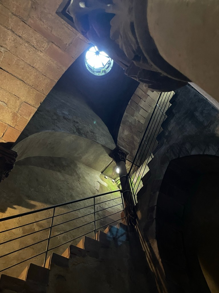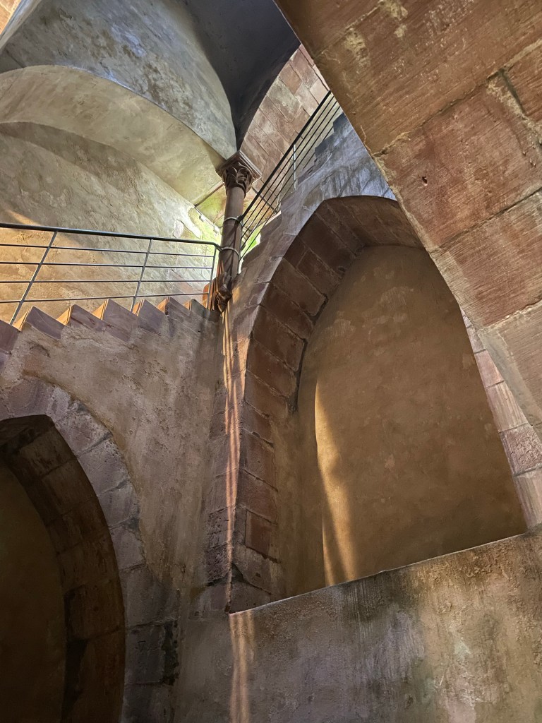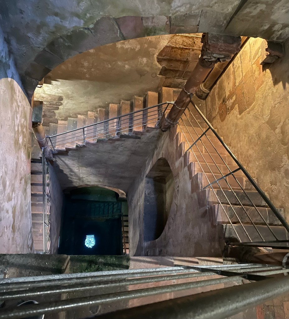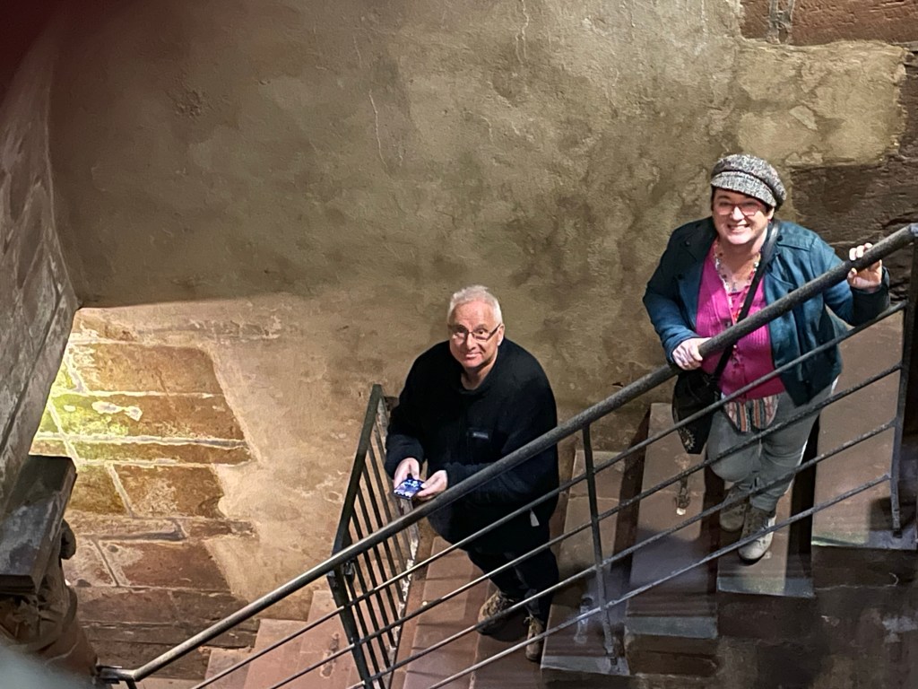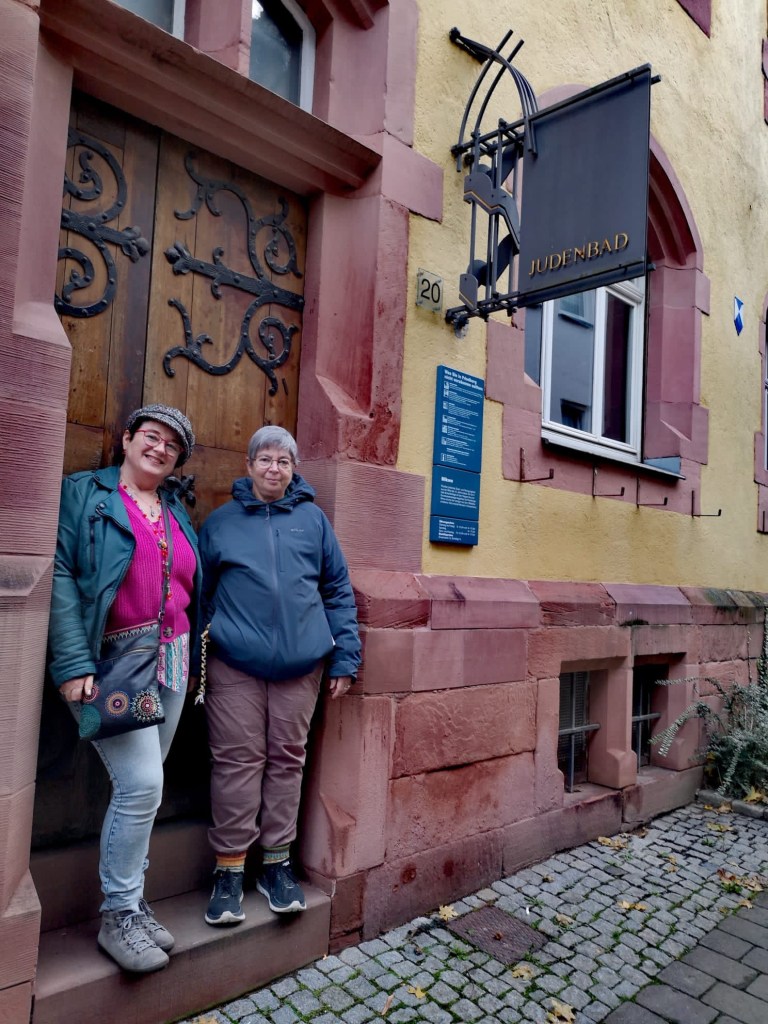 On Sunday, we visited the town of Friedberg which was one of the most important trade cities during the middle ages. In the 13th century, one of the rich Jewish merchants, Isaac Ben Natan, decided to build a mikveh. Also, being built at the time was a church. Unfortunately when trying to bring the bell to the church, it toppled over and killed a child. Because of this, work on the church was suspended temporarily. The workers were hired to work on the mikveh. This made the monk in charge of the church so angry that he cursed the Mikveh. The mikveh was operational up until the 20th century though there were certain times when it was closed. However, there are many stories about women falling and hurting themselves, or in one case of a woman actually disappearing. So one really wonders about the curse. Because the town is built on a basalt hill, they had to dig fairly deep to reach water for the mikveh. The shaft going down to the water is 5 m x 5 m with a depth of 25 m. The temperature of the water is 7.5°C. It is the largest surviving Medeival mikveh in Europe, probably in the world.
