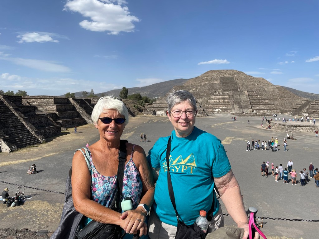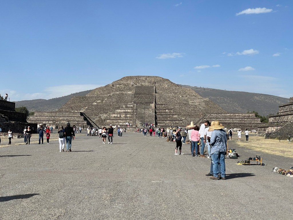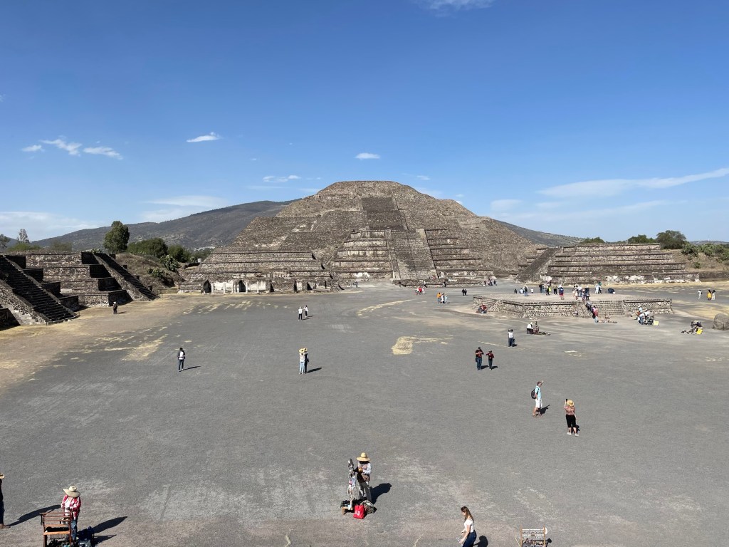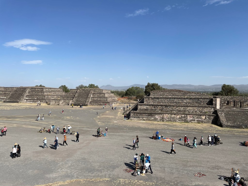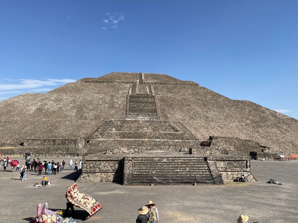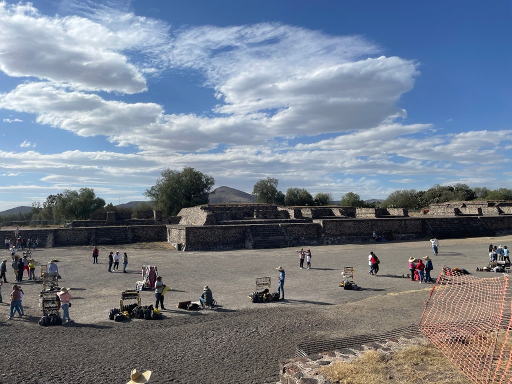 Our last stop was the ruins at Teotihuacán. The Teotihuacan culture predates the Aztecs. Teotihuacan is a vast Mexican archaeological complex northeast of Mexico City. Running down the middle of the site, which was once a flourishing pre-Columbian city, is the Avenue of the Dead. It links the Temple of Quetzalcoatl, the Pyramid of the Moon and the Pyramid of the Sun, the latter two with panoramic views from their summits. The Avenue of the Dead was actually a river. The names of the pyramids are not based on any understanding of what they were at the time they were built. Actually, inside the pyramid of the moon, they found a sculpture of the goddess of water, Chalchiuhtlicue. The sculpture is in the museum in Mexico City, and I posted a picture of it in my previous post. I started at the pyramid of the moon, and walked down the Avenue of the Dead to the pyramid of the sun. It was a beautiful day, with a gorgeous sky. I enjoyed just sitting and watching people and clouds go by.