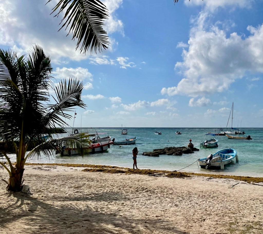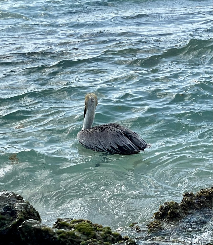 Today we decided to actually check out Akumal. Having had dinner there the other night we knew it was very touristy. There is however a public beach. So we went there this morning to go snorkeling. It was a dud. Saw very few fish, and they were not very beautiful. They actually look like the fish I would have for dinner. This is the place you’re supposed to be able to swim with turtles. However, because of the environmental impact, they have closed off that area completely. I’m not too unhappy about it, because I have swum with turtles a couple of times in the past. Also, we had such nice snorkeling here in the lagoon. I did enjoy snorkeling around just because I enjoy being in the water. The temperature of the water is ideal. You can stay in it all day but it’s not too warm just refreshing. It was a nice sandy beach. Very pretty. There were a number of pelicans around. Here are the pictures that were taken from the beach.