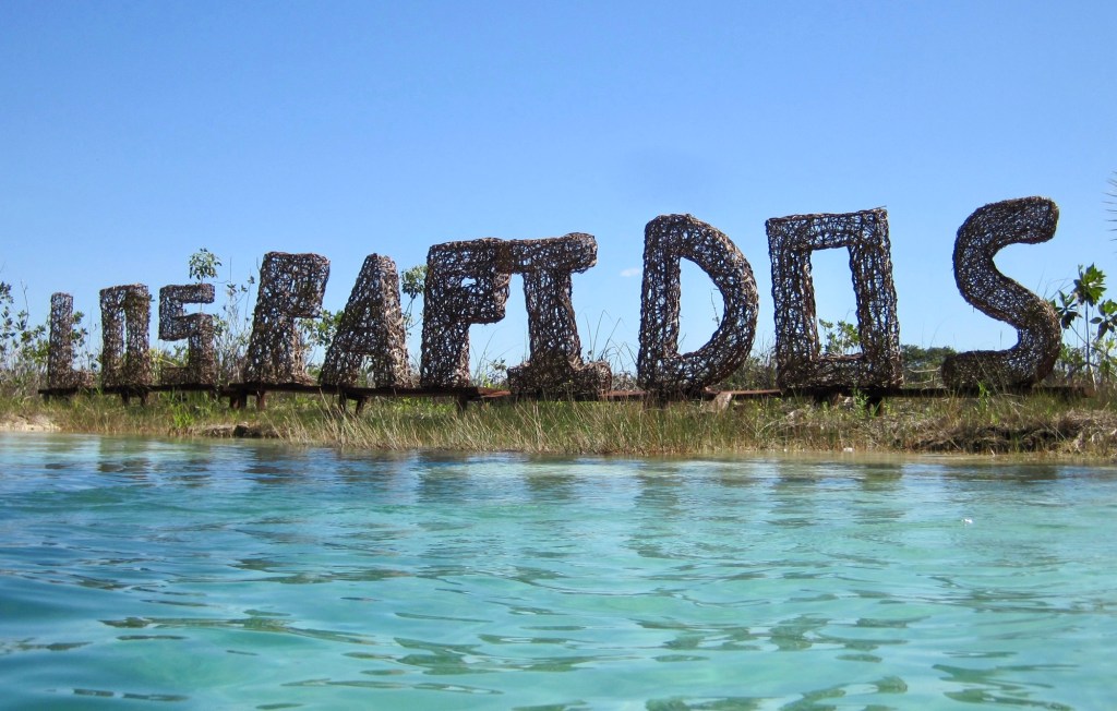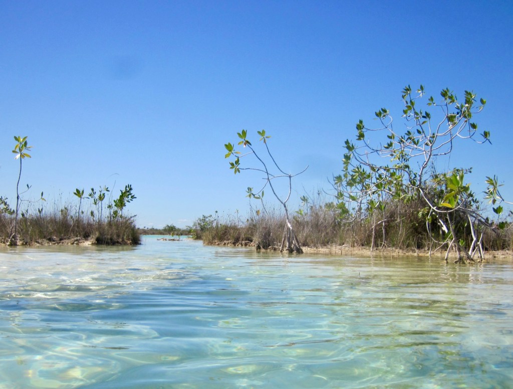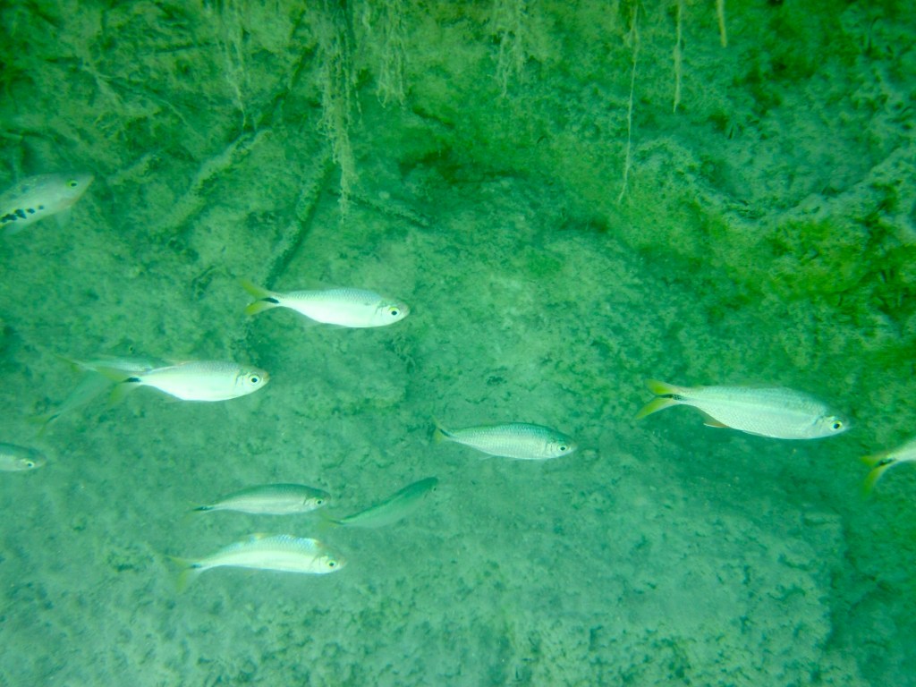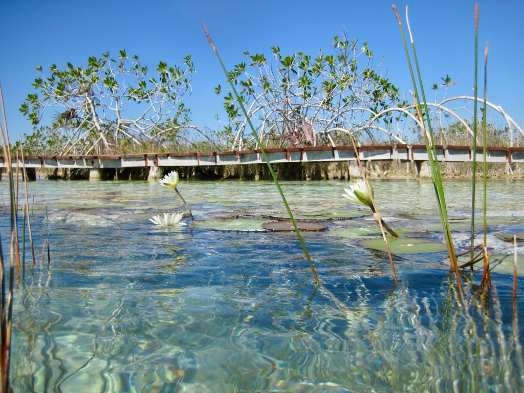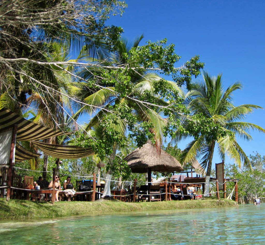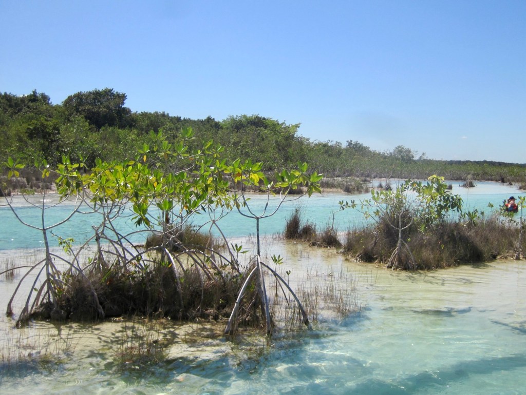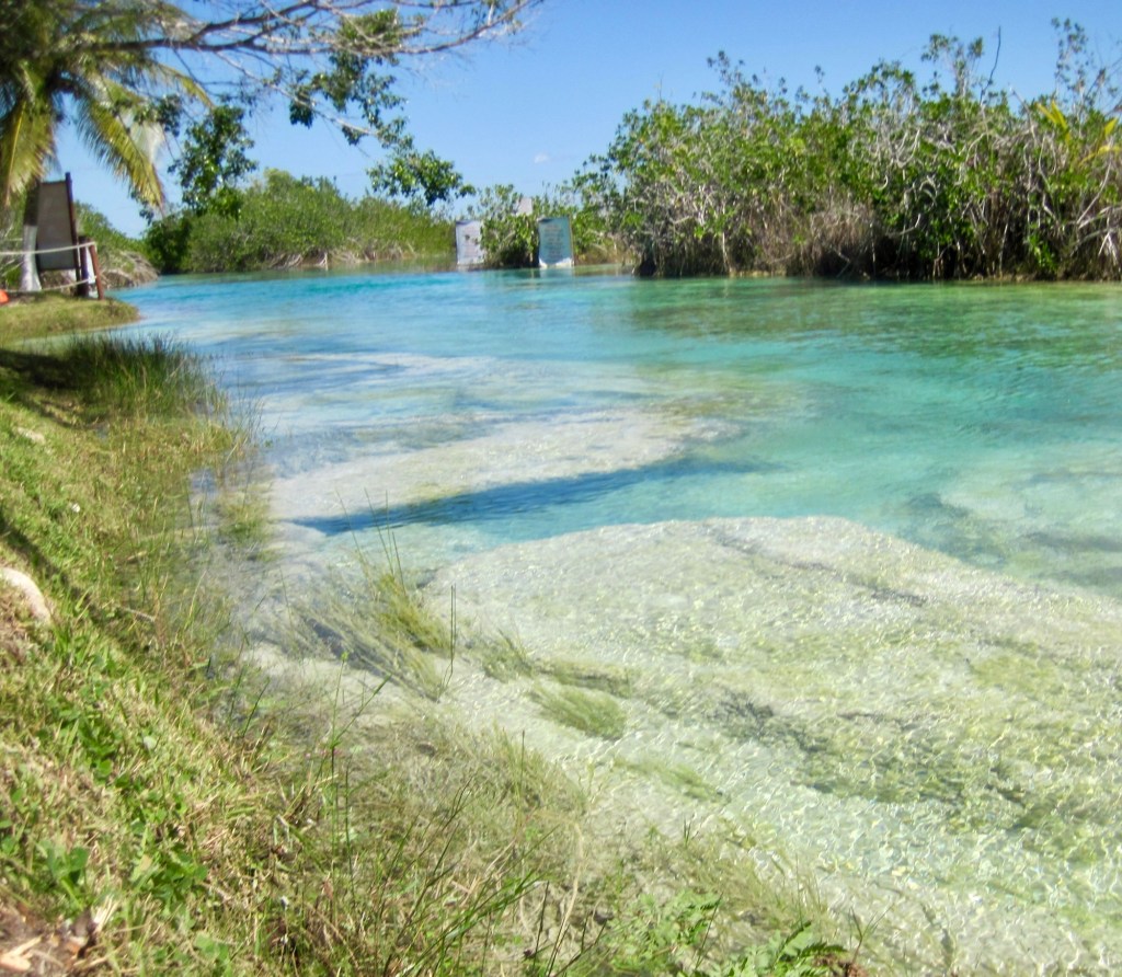Our morning adventure was to go to Los Rapidos which is located on a stream that feeds the Bacalar lagoon. The current is moving but not very swiftly so you can jump in the water and float down for a while, get back out and walk back to the start point and do it all over again. We did it four times. The water was so refreshing and beautiful. Very clear. I took the underwater camera with me, so I was able to take pictures while I was floating. In the water are stromatolites which look like boulders but are biochemical sedimentary rocks. They are a layered deposit, mainly of limestone formed by the growth of blue-green algae. Here are some pictures taken on the way to the site.