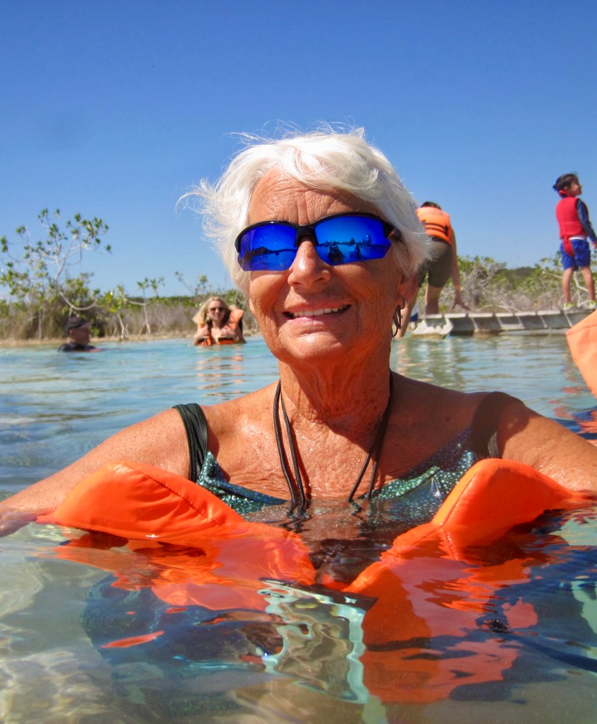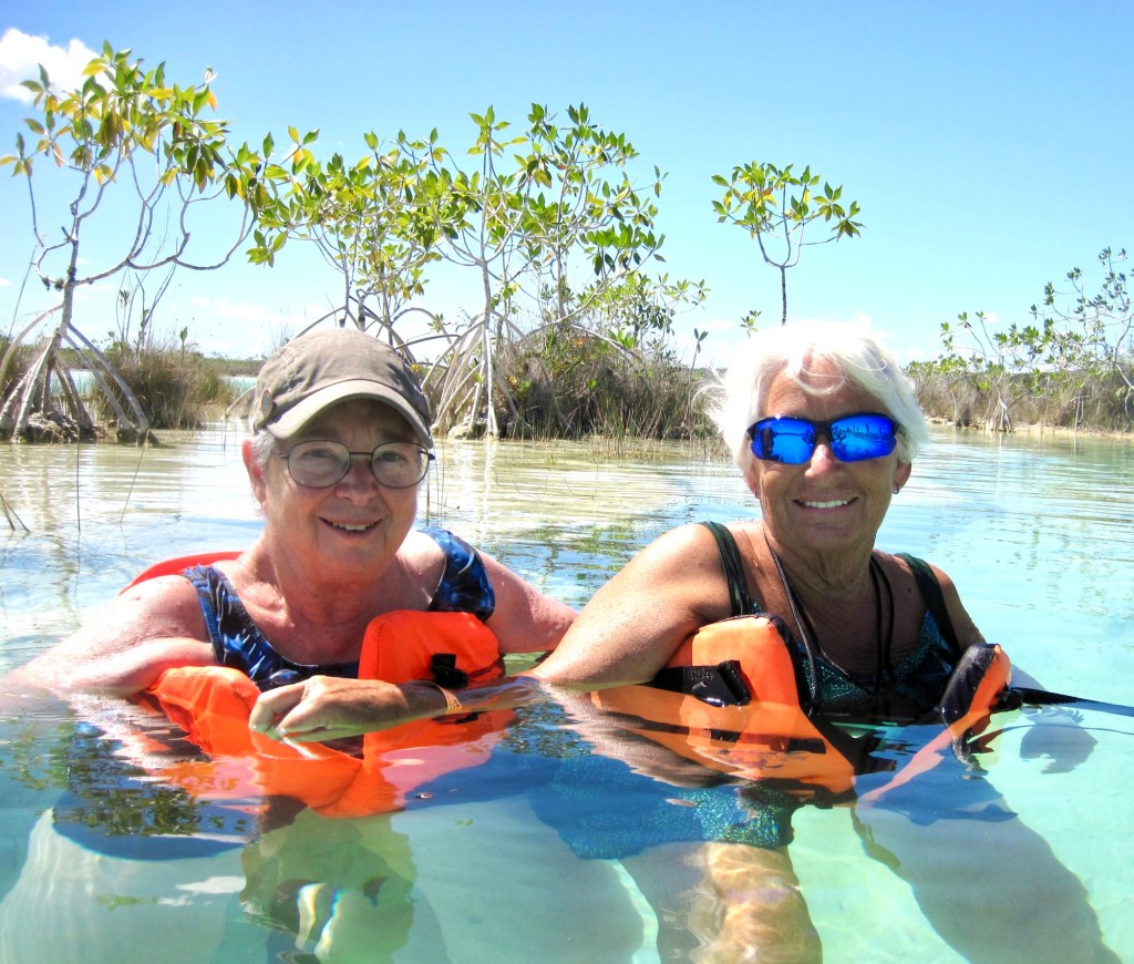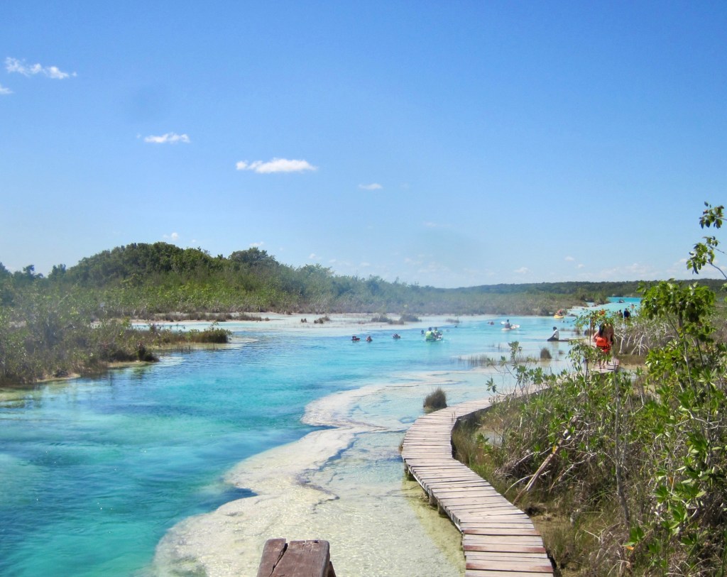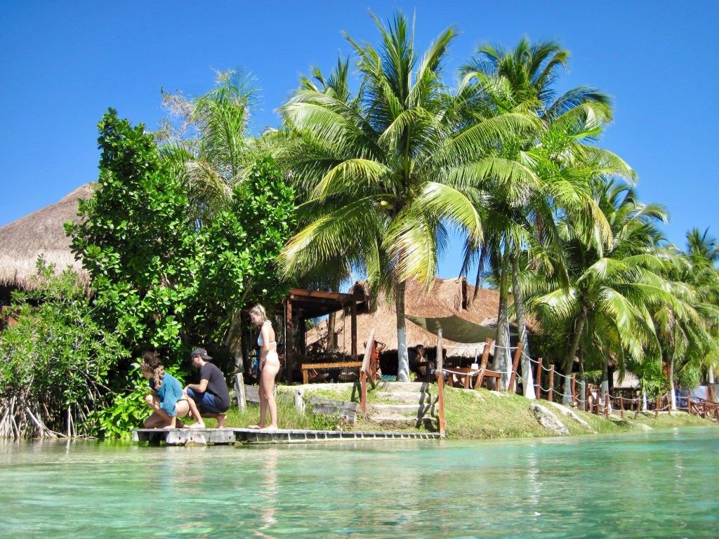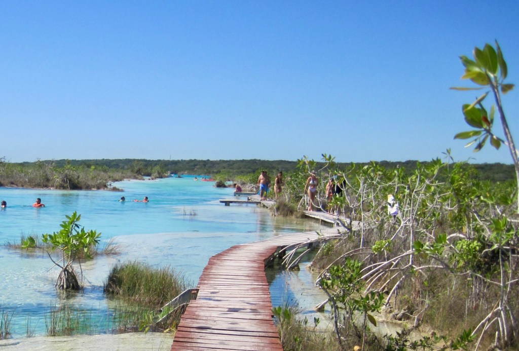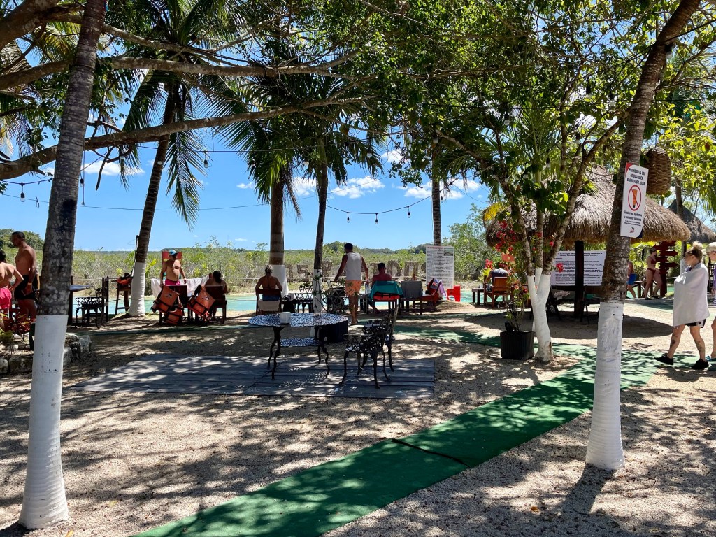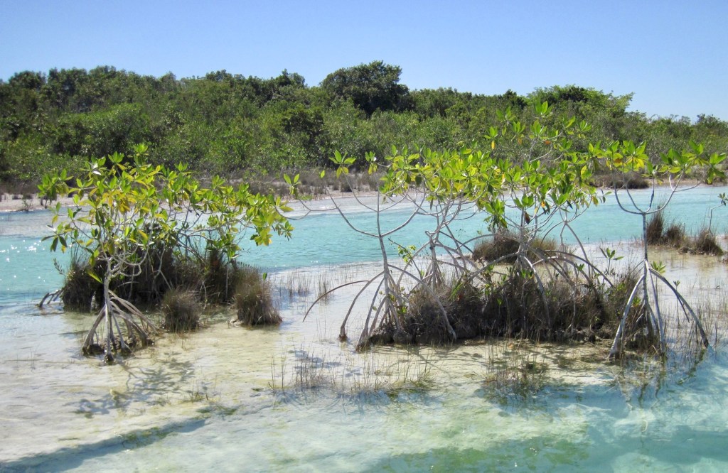 Our morning adventure was to go to Los Rapidos which is located on a stream that feeds the Bacalar lagoon. The current is moving but not very swiftly so you can jump in the water and float down for a while, get back out and walk back to the start point and do it all over again. We did it four times. The water was so refreshing and beautiful. Very clear. I took the underwater camera with me, so I was able to take pictures while I was floating. In the water are stromatolites which look like boulders but are biochemical sedimentary rocks. They are a layered deposit, mainly of limestone formed by the growth of blue-green algae. Here are some pictures taken on the way to the site.