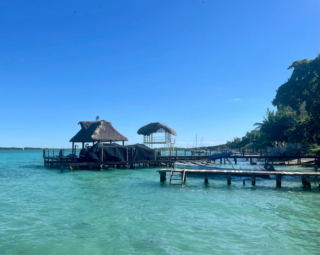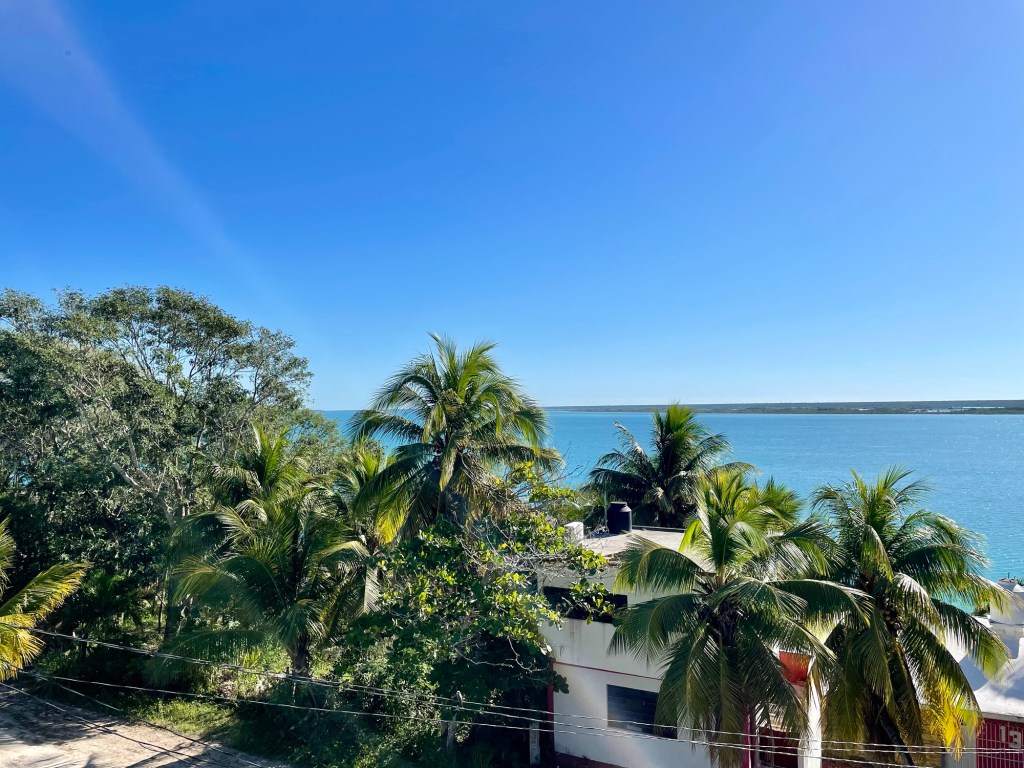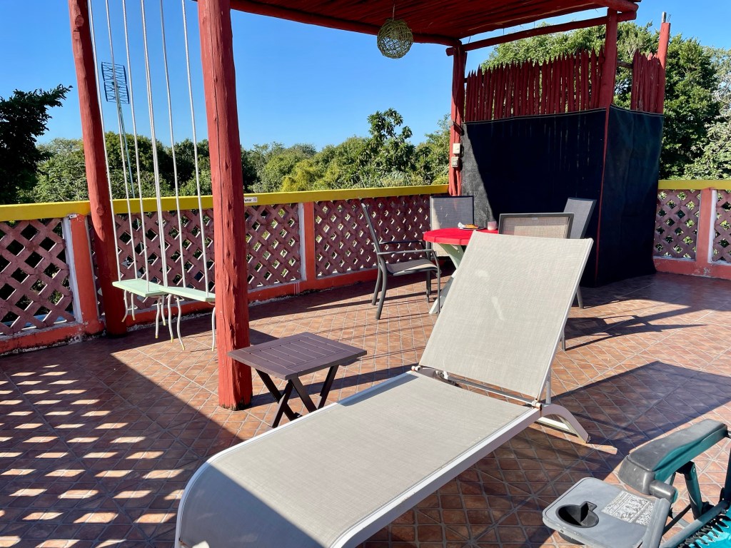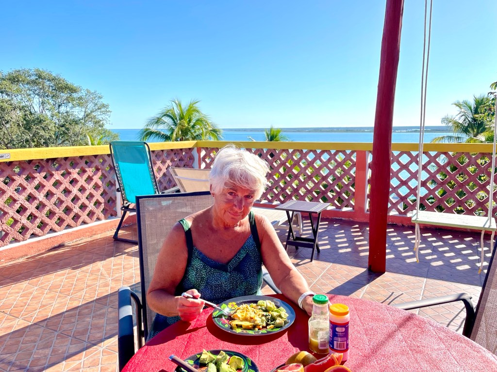 Our Airbnb in Bacalar has a porch and then a beautiful deck upstairs. We have been eating breakfast and lunch on the deck.