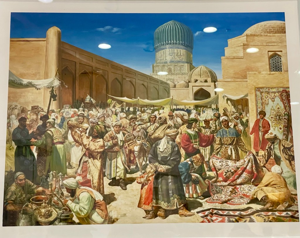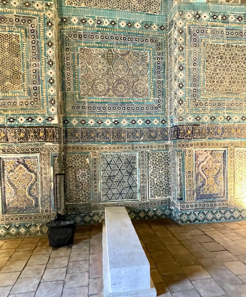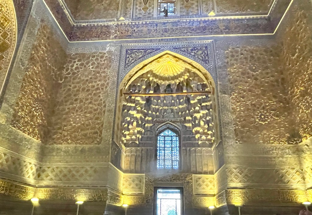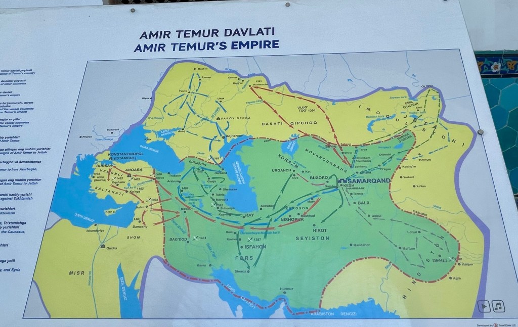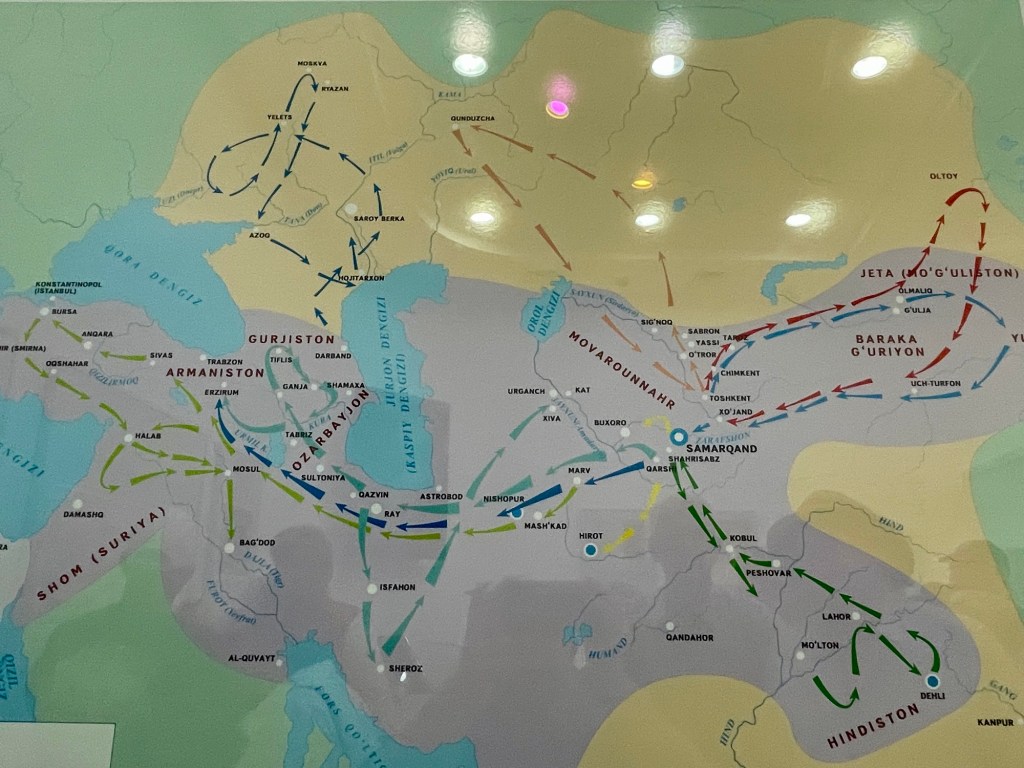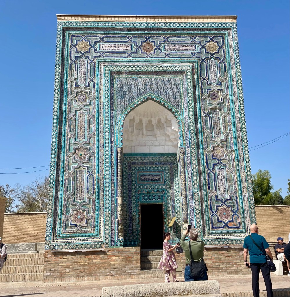 Our next visit was to the Mirzo Ulugbek observatory. Ulugbek was the grandson of the famous ruler Amir Timur who I will talk about later. Ulugbek was notable for his work in astronomy-related mathematics, such as trigonometry and circle geometry, as well as his general interests in the arts and intellectual activities. It is thought that he spoke 5 languages in addition to a small amount of Chinese. During his rule (first as a governor) the Timurid Empire achieved the cultural peak of the Timurid renaissance through his attention and patronage. Samarkand was captured and given to Ulugbek by his father. He built the observatory in Samarkand between 1424 and 1429. It was considered by scholars to have been one of the finest observatories in the Islamic world at the time and the largest in central Asia. Ulugbeh was subsequently recognized as the most important observational astronomer from the 15th century by many scholars. However, Ulugbek’s scientific expertise was not matched by his skills in governance. During his short reign, he failed to establish his power and authority. As a result, other rulers, including his family, took advantage of his lack of control, and he was subsequently overthrown and assassinated.