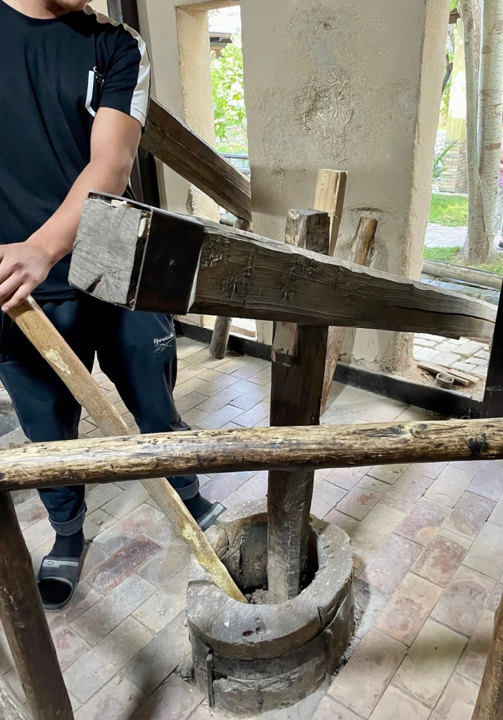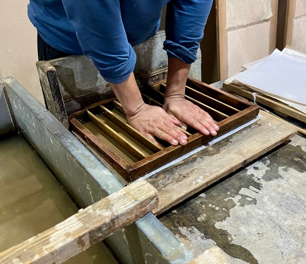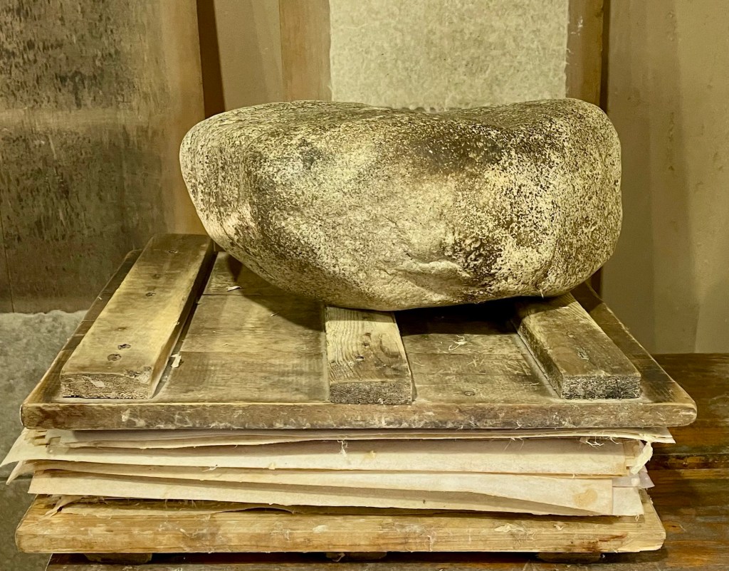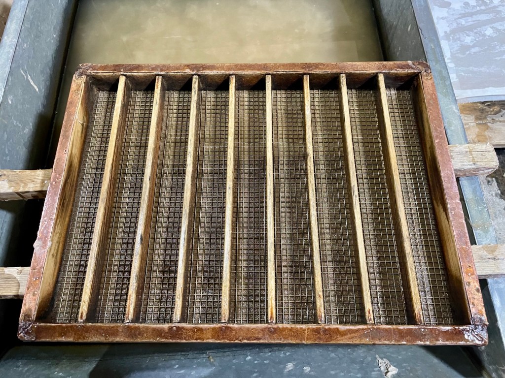 From here the strips are made into pulp. The process is driven by a water wheel that turns an axle that drives the mashing of the strips.
