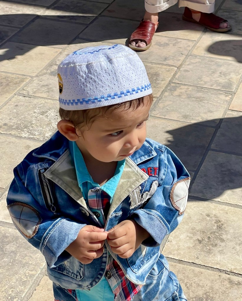 Throughout the old city, of course there are all kinds of merchants trying to sell stuff. The next picture is our guide modeling a hat that is used in the summertime because the sheep’s wool comes down and protects your eyes.