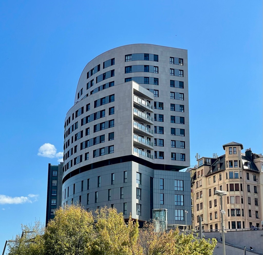 THERE IS LOX ON THE BREAKFAST BUFFET. Our first activity was a panoramic bus tour of Bilbao. Bilbao was a heavily industrial town until the middle to late 20th century when industry dried up. The town then made a conscientious decision to hire some really good architects to build up the town in order to attract tourism and other financial investments. It has been highly successful. Here is a picture taken in the newest section of town.