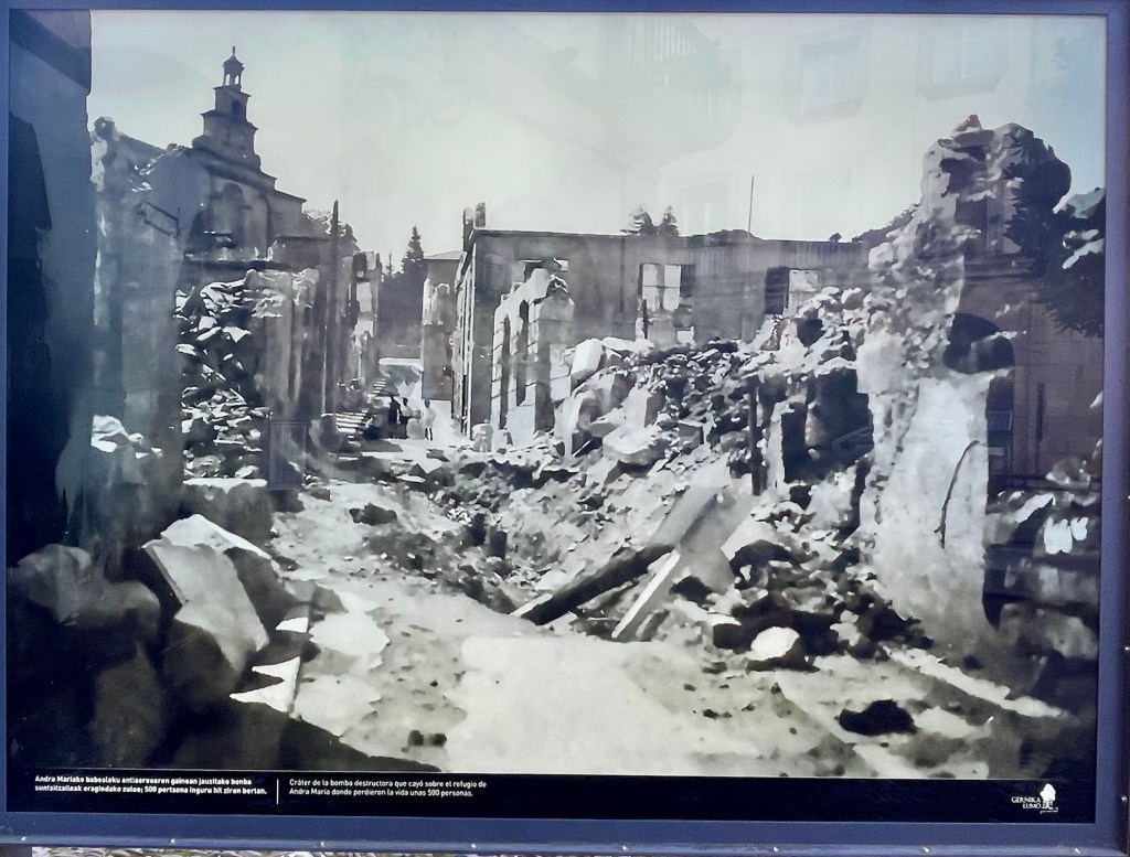 One of the main reasons I wanted to come to the north of Spain was to go to Guernica. Guernica is a relatively small town, just east of Bilbao in Basque Country. During the Spanish Civil War from 1936-1939, which put Franco in power, the Basque people fought against Franco. Franco was determined to unify all of Spain with the same culture and language. Obviously this did not sit very well in Basque country. So in April 1937, Franco enlisted the Germans to bomb Guernica. Since Hitler was planning to start a major war, he was very interested to see how his Air Force would do. They picked a Monday which is market day so more people would be out and about. It was a slaughter. A journalist who arrived on the scene published pictures of the destruction. Pablo Picasso, who was living in Paris at the time, saw these pictures and painted his famous rendition of the event. I saw his masterpiece at the Museum of Modern Art in New York when it was traveling from its permanent home in Madrid. I also own a print of the Guernica which I hung in my apartment until I got married.