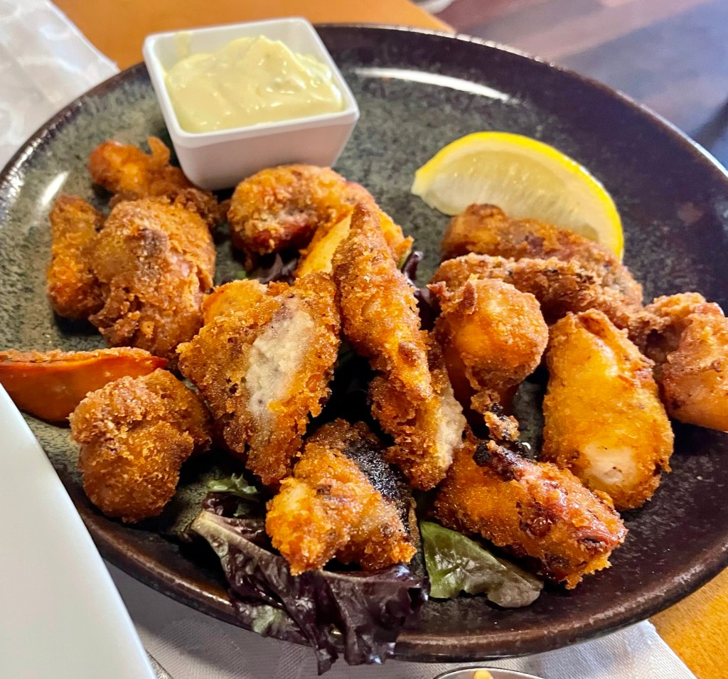Our lunch consisted of grilled shrimp, fried octopus and a wonderful fresh salad. To accompany lunch, we had cerveza.