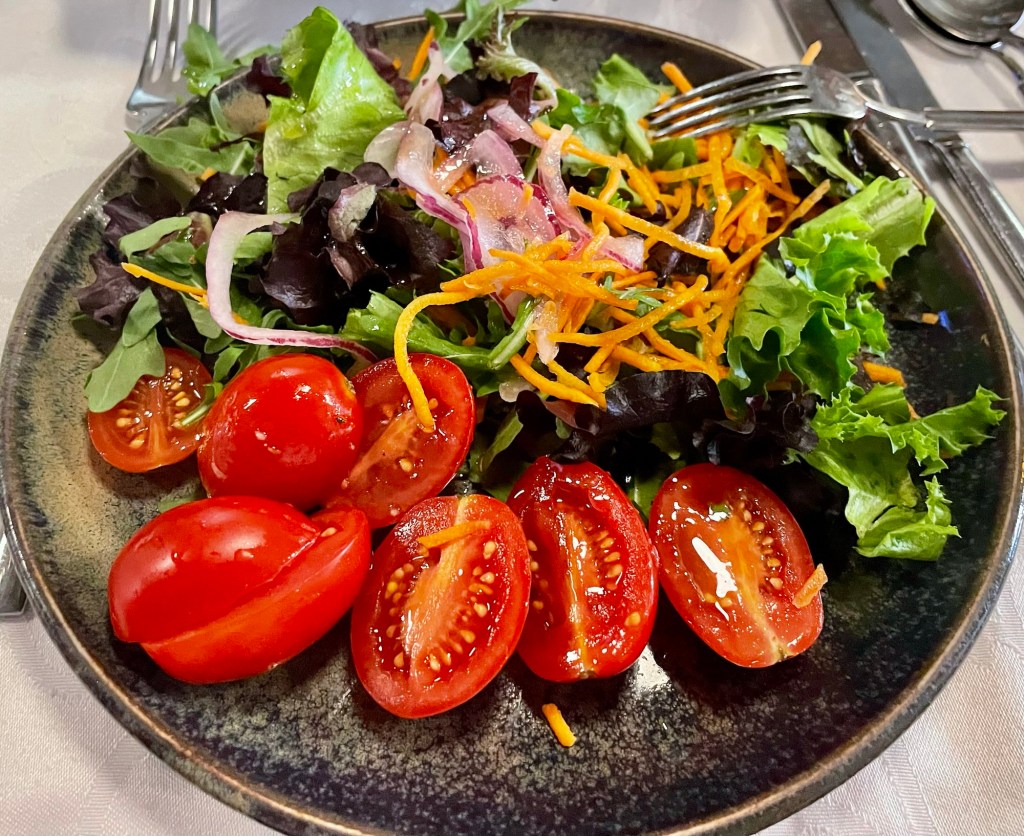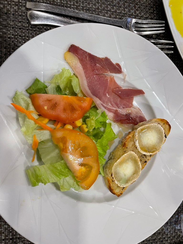 Our appetizer at dinner which included this delightful goat cheese in olive oil on toasted bread. We also have a salad and some jamon (Spanish for ham).